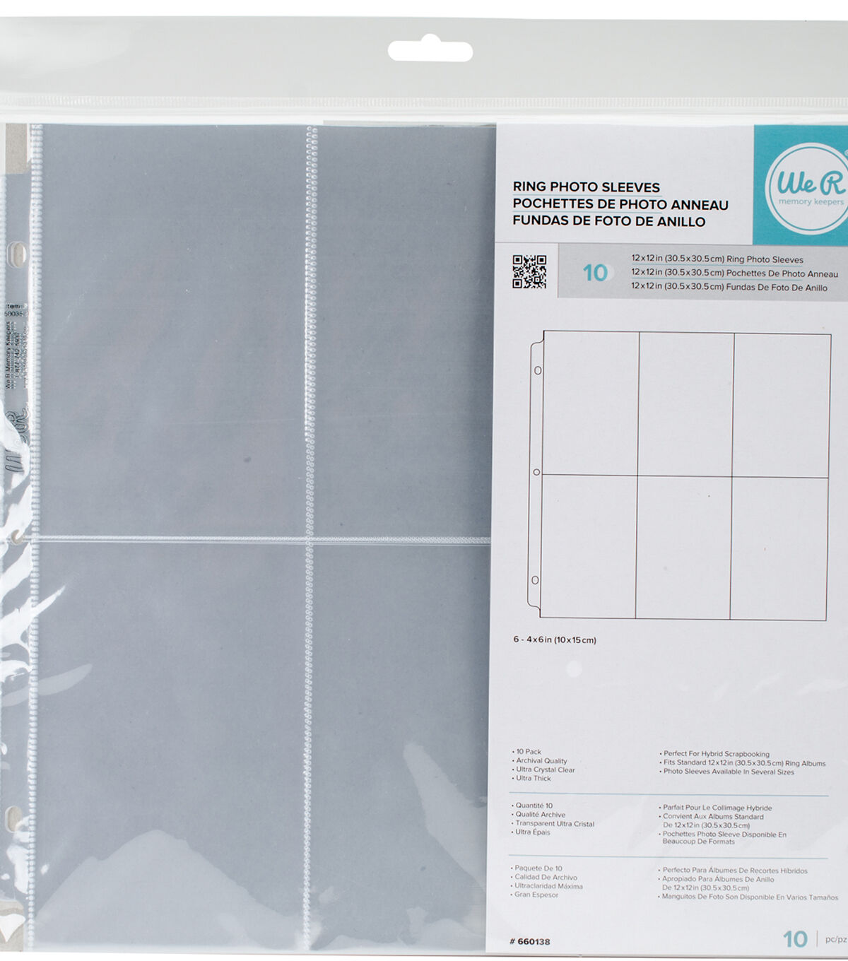 We R Memory Keepers-Ring Photo Sleeves. These low glare, ultra clear polypropylene film photo sleeves are perfect for hybrid scrapbooking! Fits standard 12x12 inch three-ring albums. This package contains ten 12x12 inch ring page protectors with six 6x4 inch pockets in each. Acid and PVC free. Archival quality. Imported.