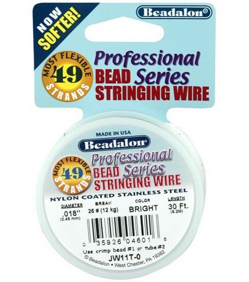 Professional-series Beadalon 49 combines the flexibility and convenience of thread with the strength and durability of stainless steel wire. Specially designed for stringing ceramic, glass, metal and stone beads as well as seed beads and freshwater pearls, Beadalon 49 is the softest and most flexible of all Beadalon varieties, and designs fashioned from Beadalon 49 drape very naturally without kinking. The forty-nine miniature stainless steel wire incorporated into Beadalon 49 make it the finest choice for creating jewelry designs that look professional and remain secure. The smooth nylon coating provides good abrasion resistance, prevents kinking, prolongs strand life and provides color to strands. Beadalon 49 is easy to use without the aid of a beading needle, but is so soft & flexible that it can be knotted. Finish strands with conventional knotting or use crimp beads to complete beautiful jewelry creations.