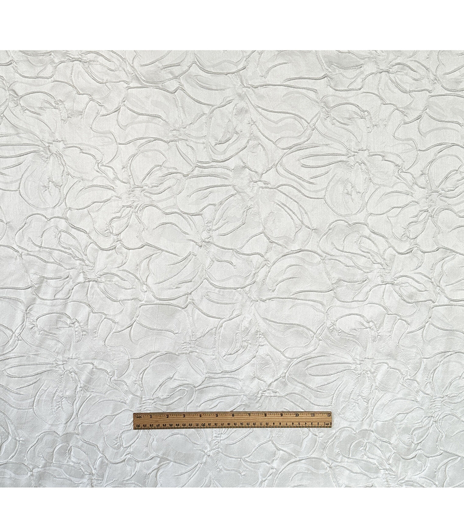 Our White Embossed Floral Jacquard Fabric is made of 100% polyester, ensuring durability and longevity. It is easy to care for, simply machine wash gentle cold, cool iron, nonchlorine bleach, and line dry. This imported fabric is 57 inches wide, making it a versatile choice for a variety of projects.