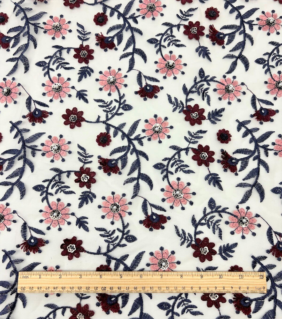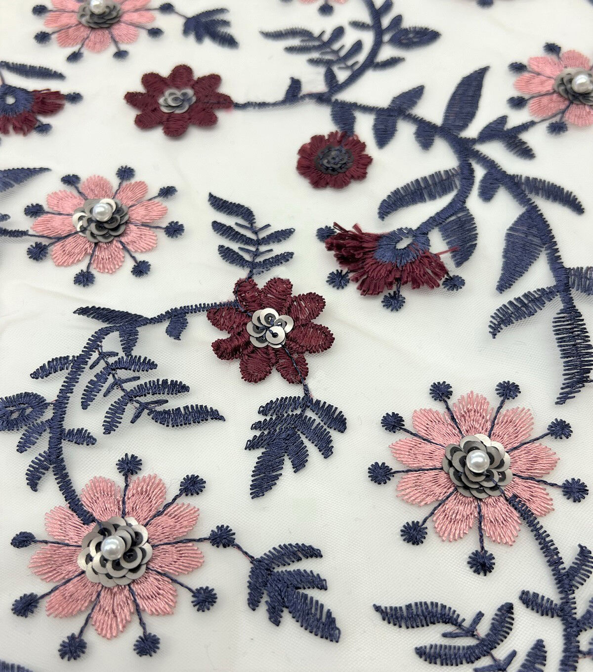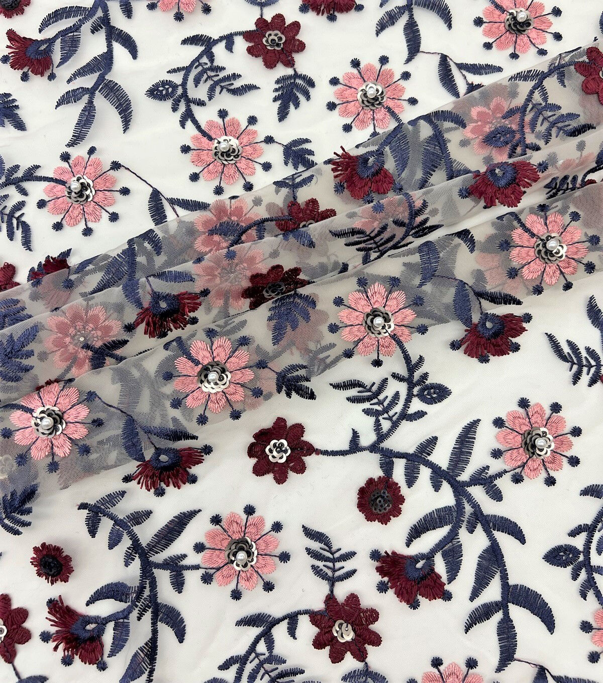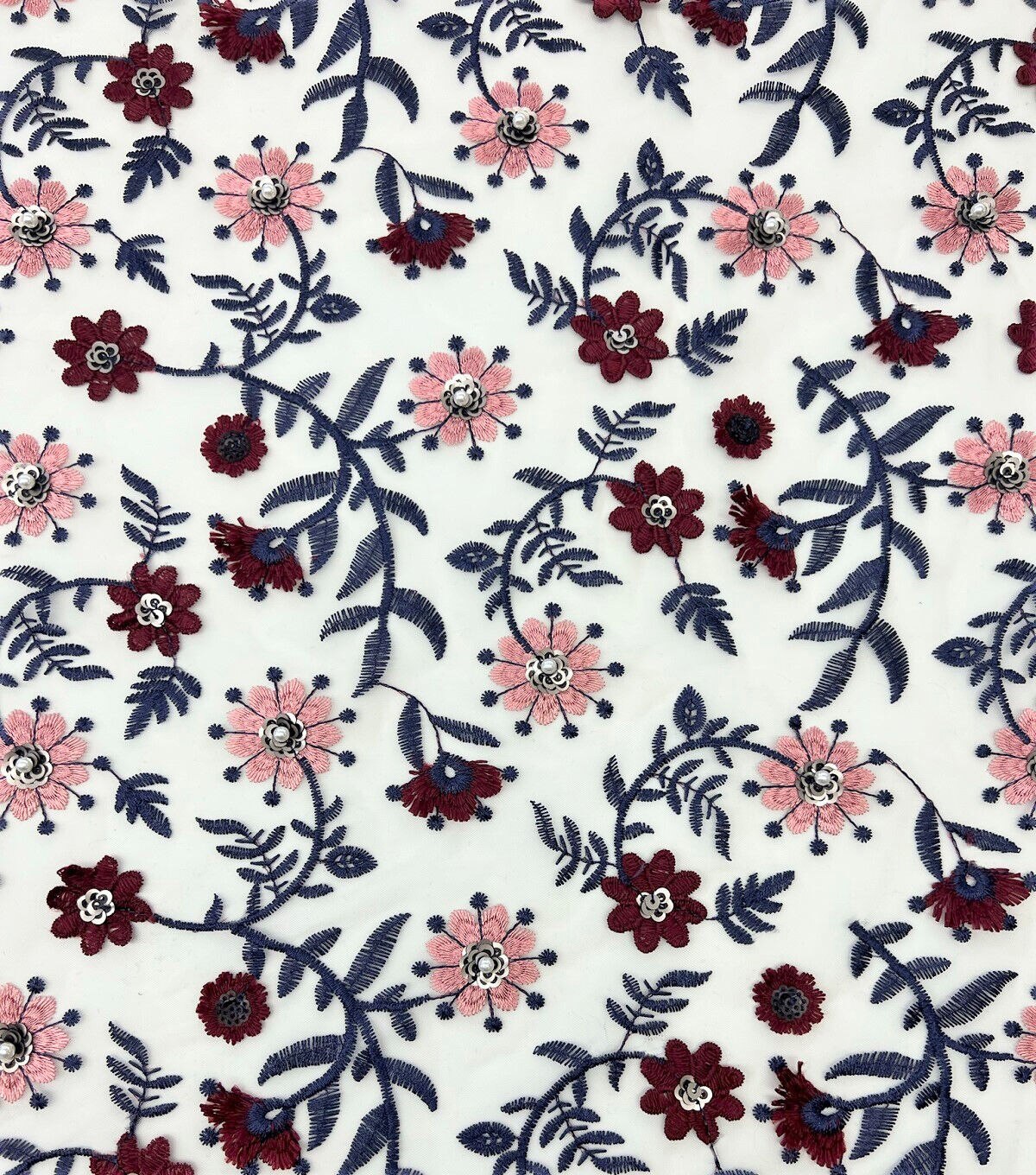 White Floral Sequin Embroidered Mesh Fabric