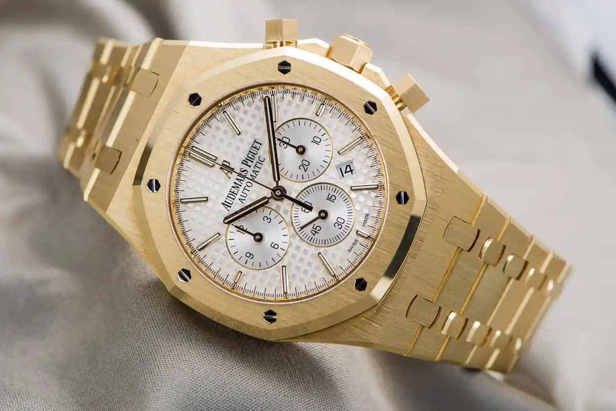 DIAL : White dial with “Grande Tapisserie” pattern, White counters, yellow gold applied hour-markers and Royal Oak hands with luminescent coating