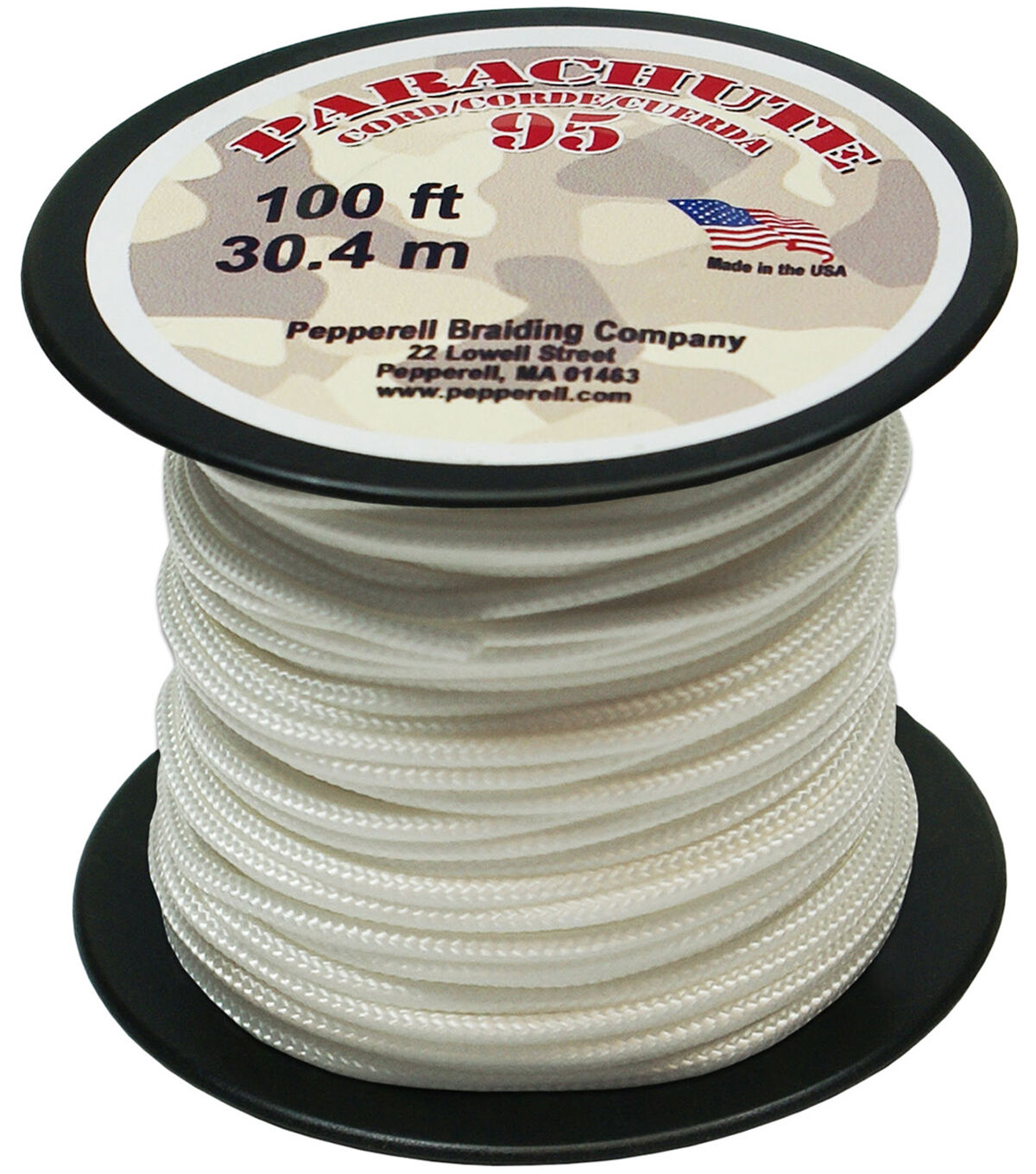 PEPPERELL-Parachute Cord 95. Use this cord for starting out a fun and new project using your favorite colors of cord! The cord is made of braided nylon and each strand measures about 2mm thick. The soft braided outer shell is durable, yet cushions, allowing this cord to be flexible, yet comfortable enough to wear against the skin. This package contains one 100ft roll of parachute cord. Available in a variety of colors, each sold separately. Made in USA.