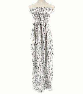 Transform your wardrobe with the White Wildflower Smocked Cotton Fabric. This versatile fabric is perfect for creating a strapless smock dress with just one seam up the middle. The customizable length allows you to wear it as a maxi dress or shorten it to make a mini/midi dress or even a summer blouse. You can even use the fabric removed from the hem to create sleeves or add ruffles to the hem for a unique touch.