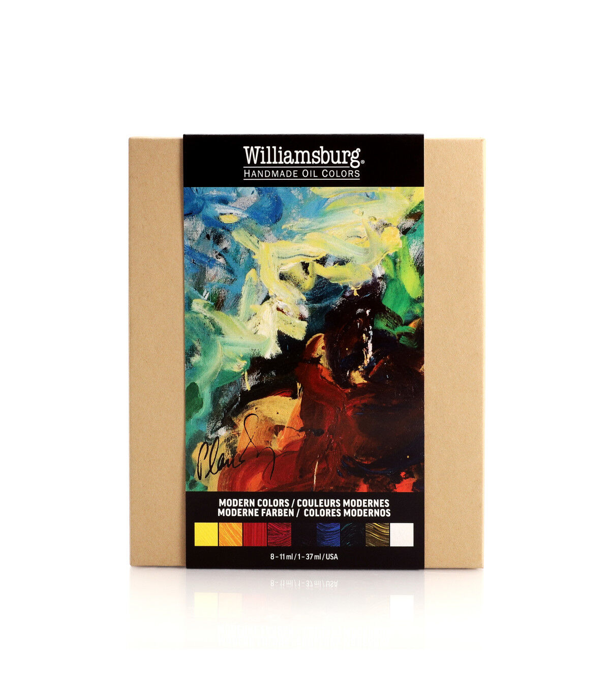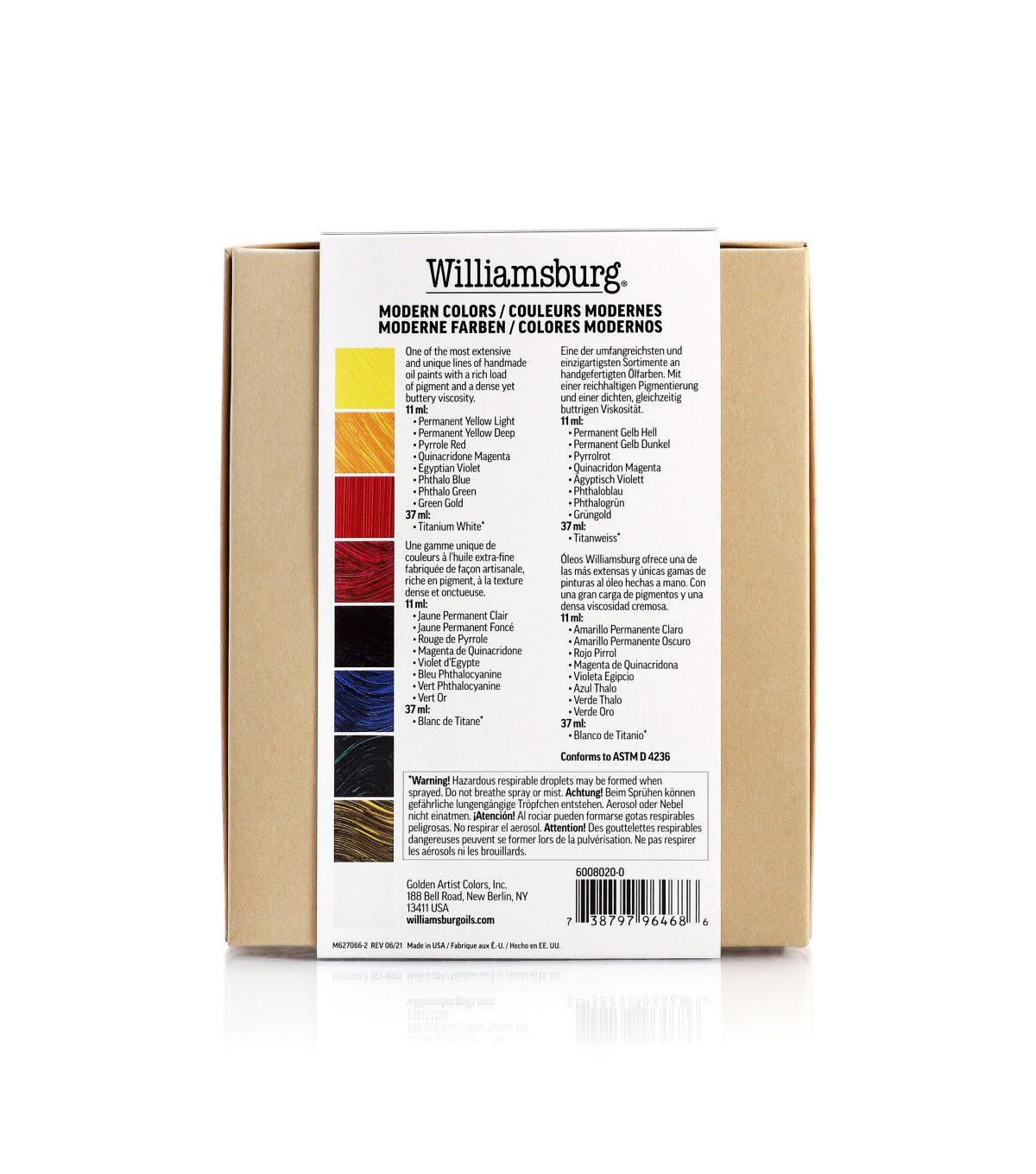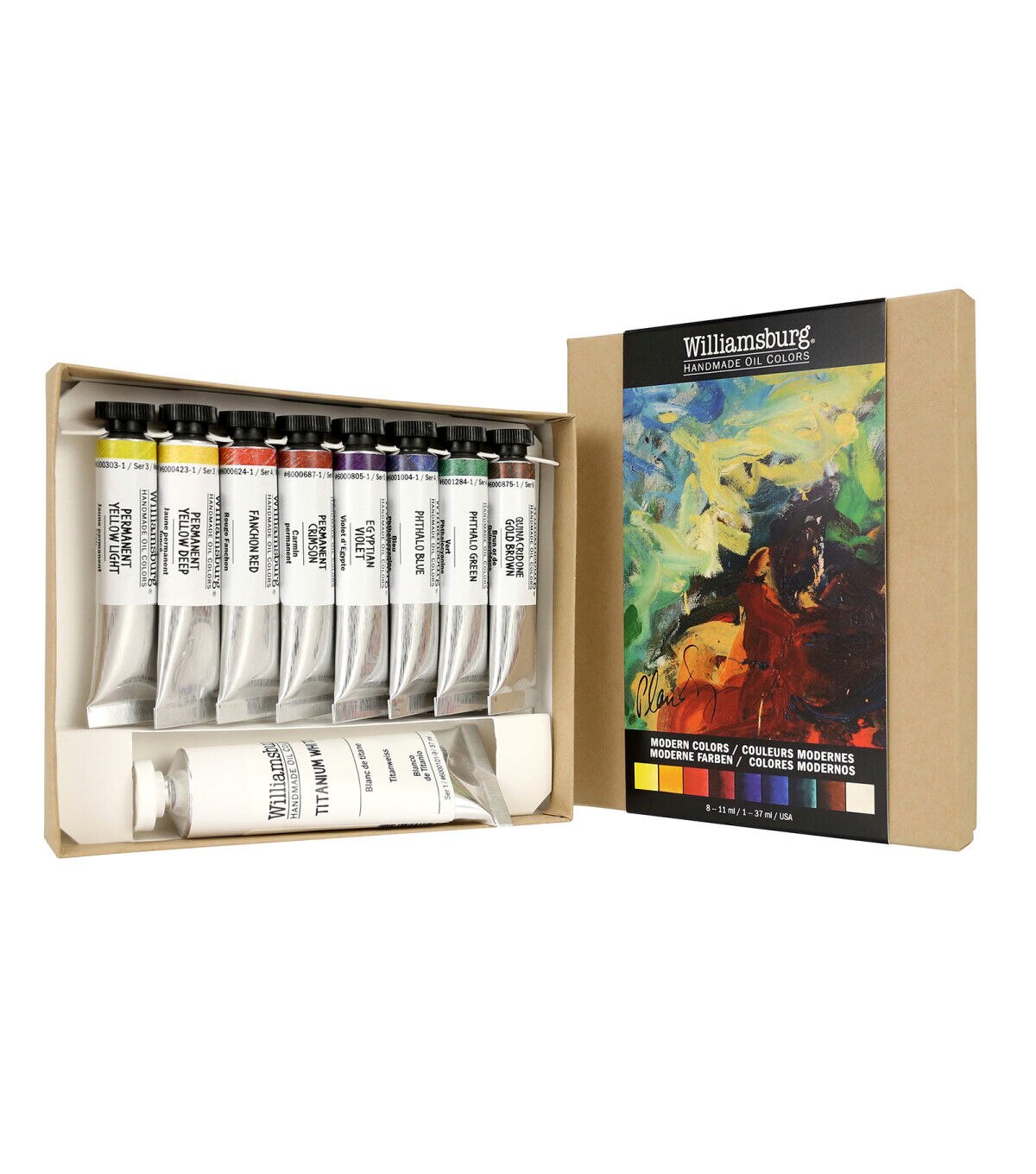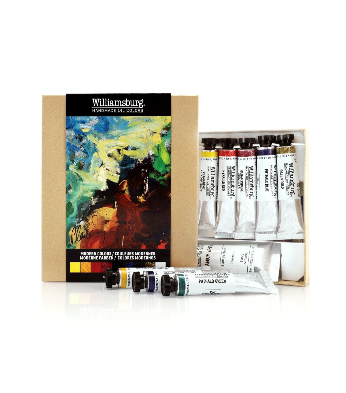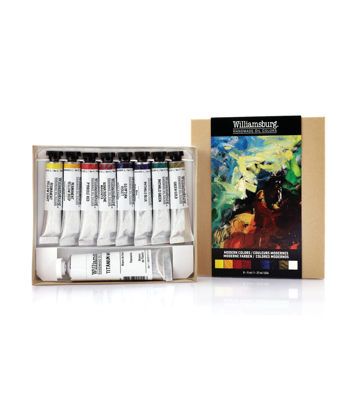 This set is crisp and bright, with the ability to produce strong and clean tints. The modern colors are an excellent choice for painters looking to supplement their traditional colors with higher chroma alternatives and contemporary painters looking to explore a modern palette. Set contains 11ml tubes of permanent yellow light, alizarin orange, pyrrole red, quinacridone magenta, Egyptian violet, pthalo blue, pthalo green and green gold, plus a 37ml tube of titanium white.