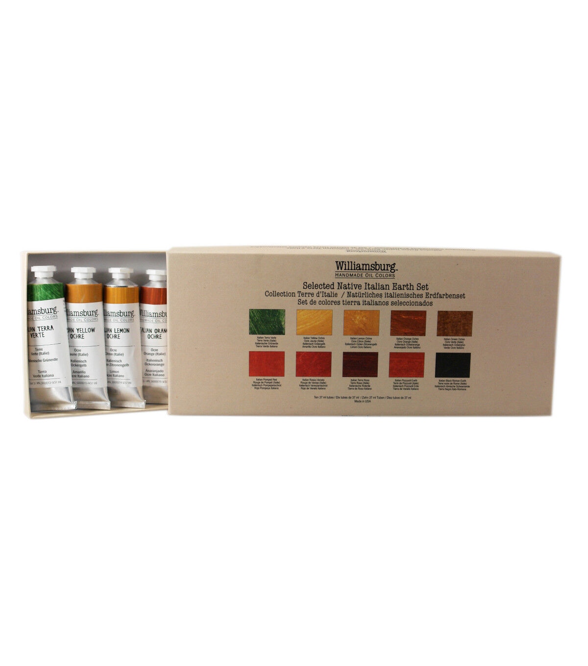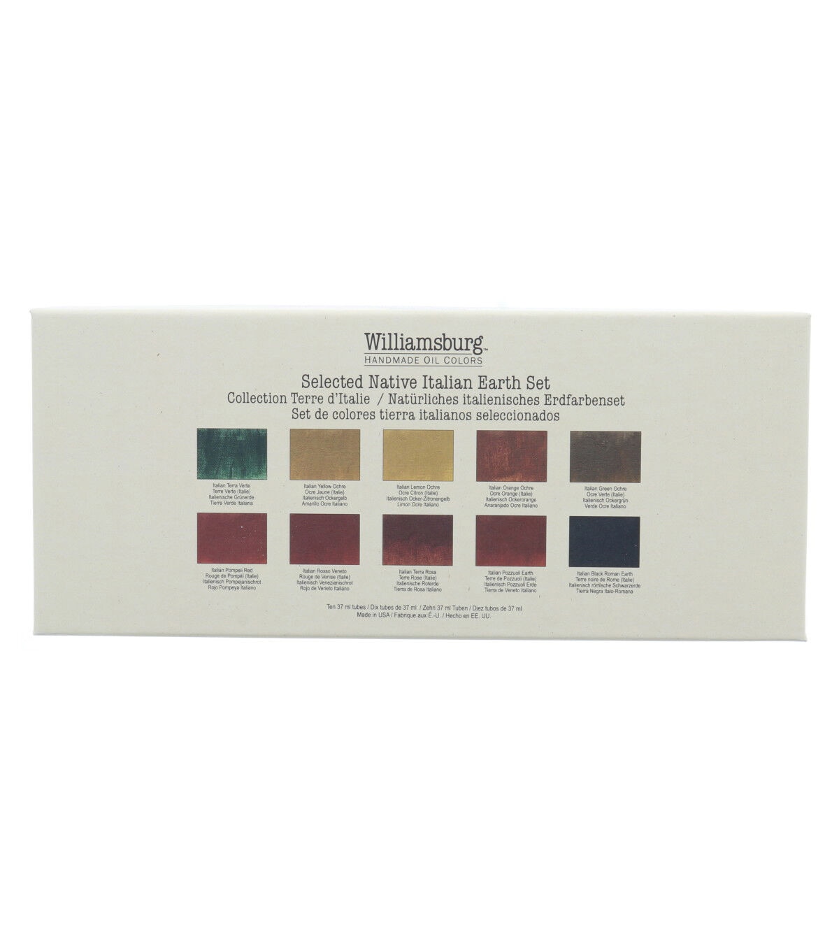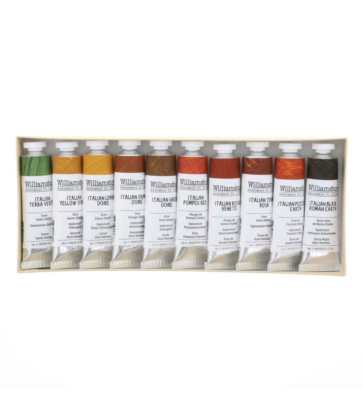 This set features Italian earth colors that are made with the same pigments made famous by the painters of the Italian Renaissance and used by conservators. They are clean, vibrant and translucent. Unlike synthetic iron oxides, they feature authentic pigments from different regions of Italy, so no two natural earths are ever alike. This 10-color set includes 37ml tubes of Italian terra verte, Italian yellow ochre, Italian lemon ochre, Italian orange ochre, Italian green ochre, Italian Pompeii red, Italian rosso veneto, Italian terra rosa, Italian Pozzuoli earth and Italian black roman earth.