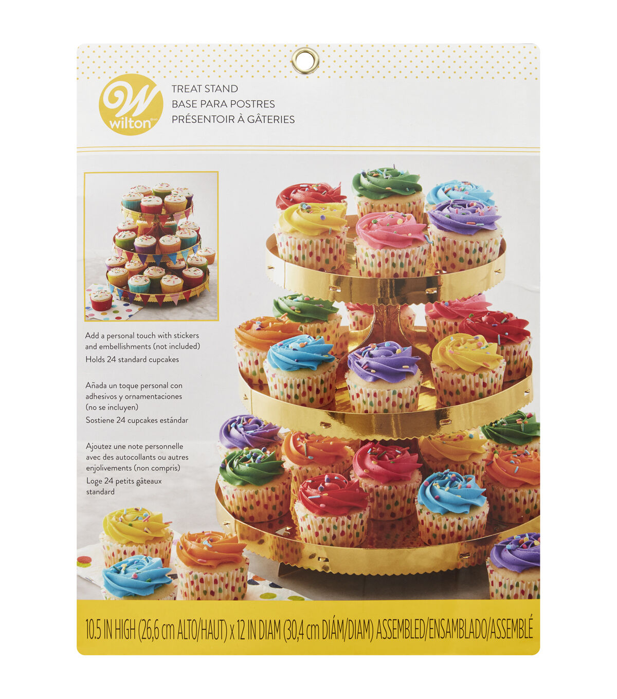 Show off your homemade cupcakes, brownies and other treats with this Wilton Gold 3-Tier Ready-to-Build Treat Stand. Standing 10.5 in. high and 12 in. wide, this cardboard disposable treat stand is large enough to hold up to 24 standard cupcakes. You can also use it to hold other treats, such as mini cupcakes, brownies and cookies. For a healthier option, use the stand to hold a variety of fresh fruits, crackers, cheeses and more. Easy to assemble, this cardboard treat stand is a rich gold color, easy to match to several birthday and holiday themes. You can even customize it with ribbons, stickers and other embellishments (not included). Includes one large, one medium and one small tier. Instructions are included.