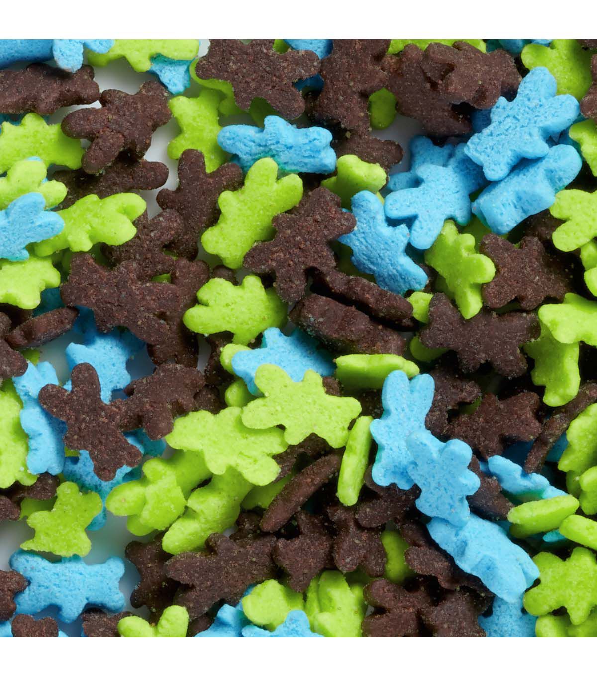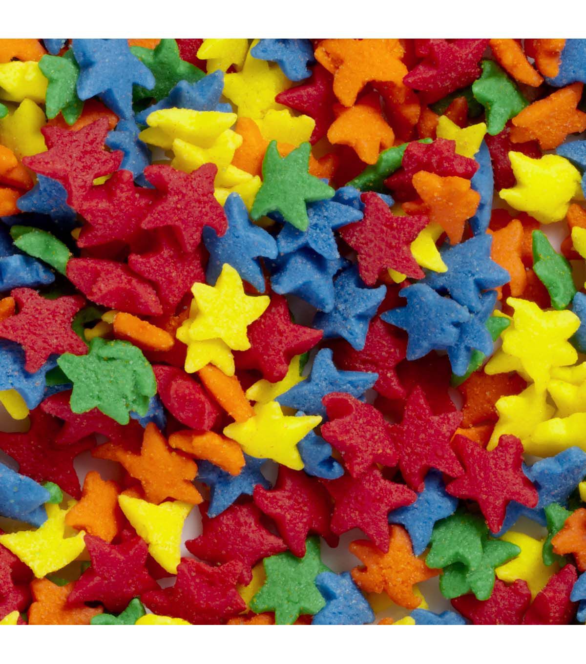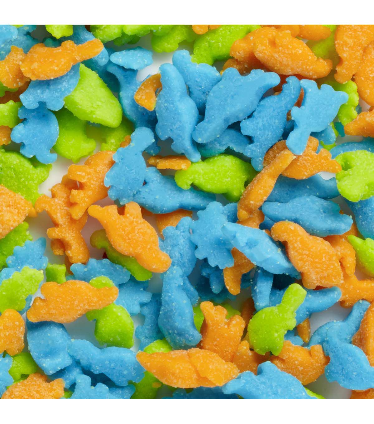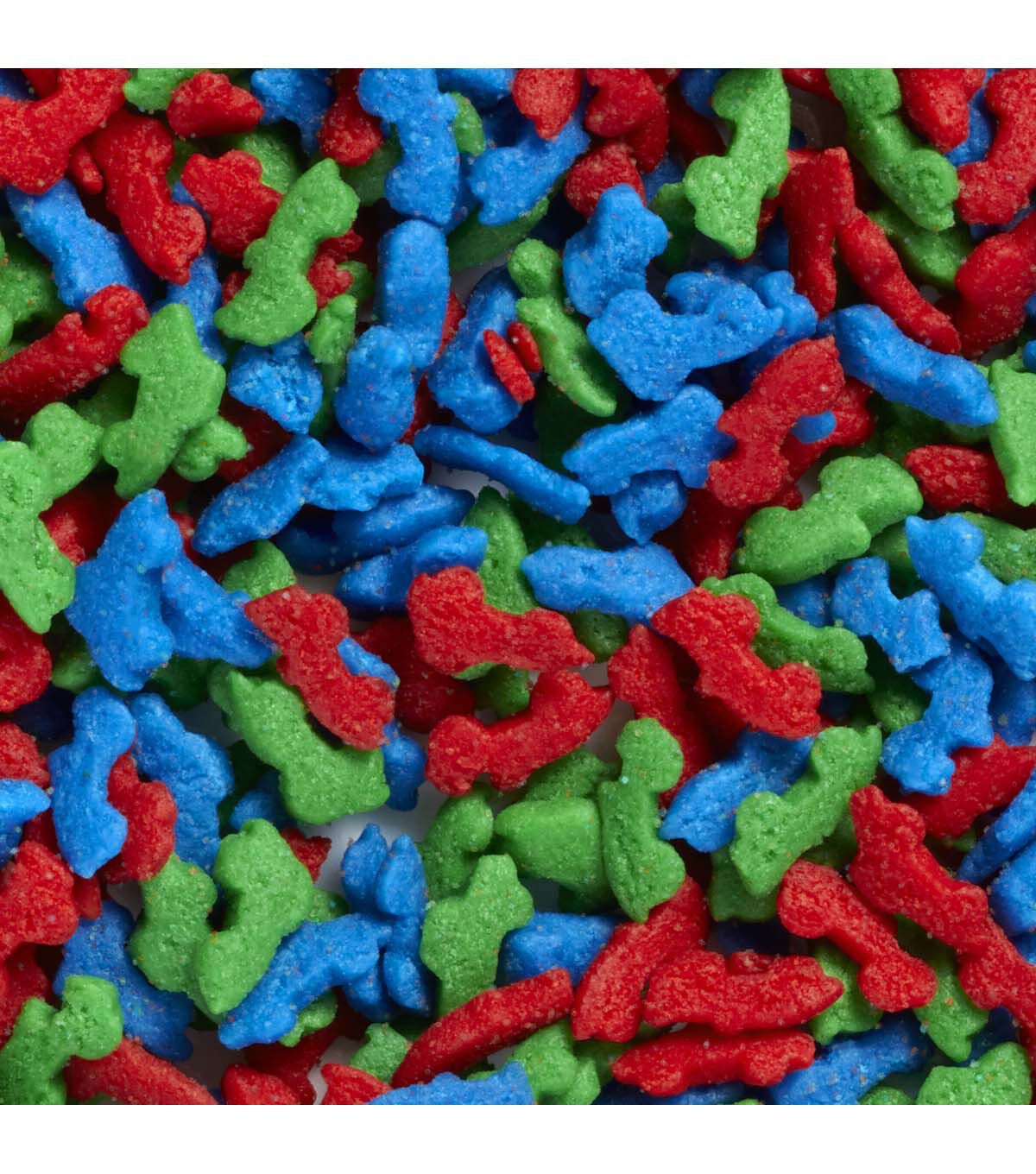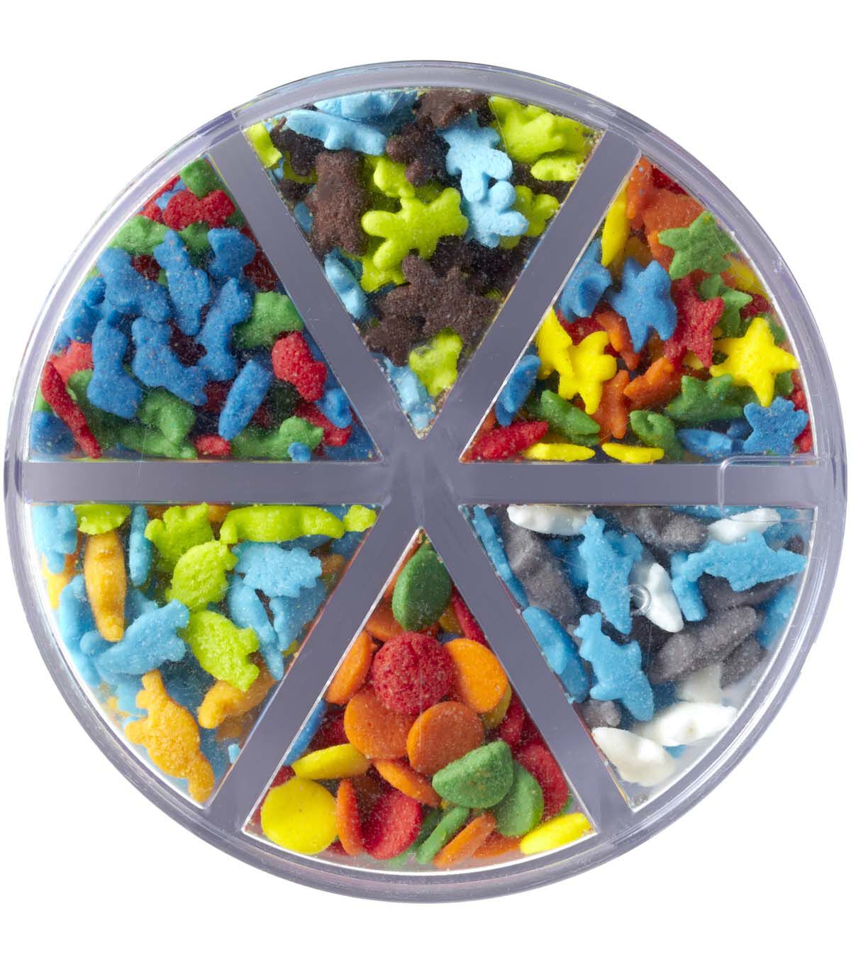 Top cakes, cookies, cupcakes and other treats with this Wilton Colorful Animals and Stars 6-Cell Sprinkles Mix. Great for birthdays, bridal and baby showers, and other themed holidays and celebrations, this sprinkles mix is a fun way to add color and texture to your desserts. This mix of shaped sprinkles contains red, green, orange, yellow and blue confetti sprinkles; white, blue and dark gray shark sprinkles; orange, green and blue dinosaur sprinkles; red, blue and green car sprinkles; yellow, blue, orange, red and green star sprinkles; and green, blue and brown bear sprinkles. Each variety of sprinkle is packaged individually with its own lid, so you can use one at a time or mix and match sprinkles for a fun look.