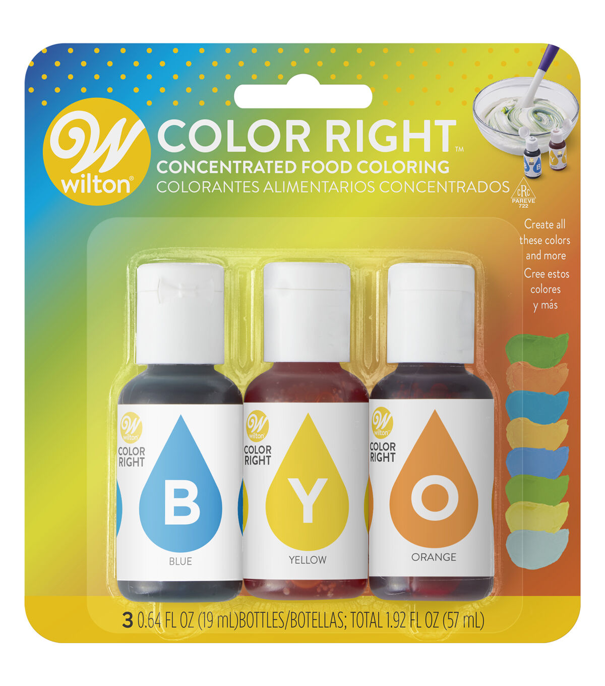 Take the guesswork out of coloring with this Wilton Color Right Concentrated Food Coloring Set. With this ultra-concentrated food coloring, you use fewer drops to color more without compromising the consistency of your icing, fondant or batter. Simply apply the drops of color as denoted on the back of the package, then mix until the color is evenly distributed. With the color mixing guide, you can repeat the process as much as needed for consistent batches every time. This small Color Right food coloring set includes three colors: Blue, Yellow and Orange. Use less drops for lighter colors or more drops for deeper colors. Safe to use in batters, doughs and other foods, this set of edible food dye is a great way to customize and personalize your treats.