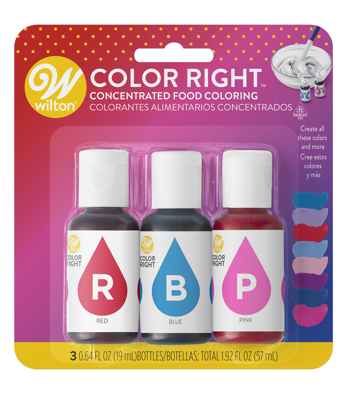 - Add rich color to your frosting, fondant, royal icing, dough, batter and more with this set of 3 Wilton Color Right gel food colors