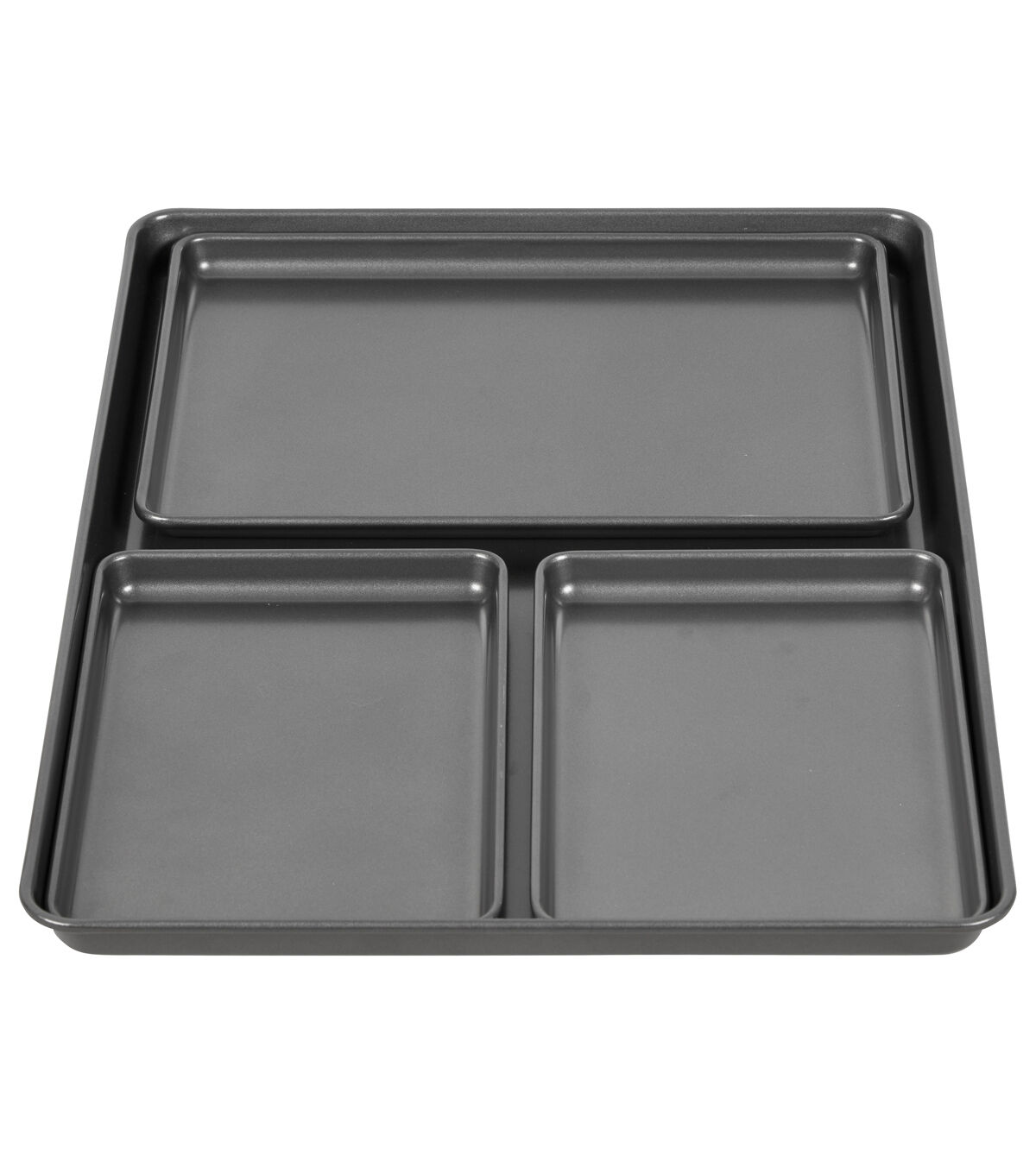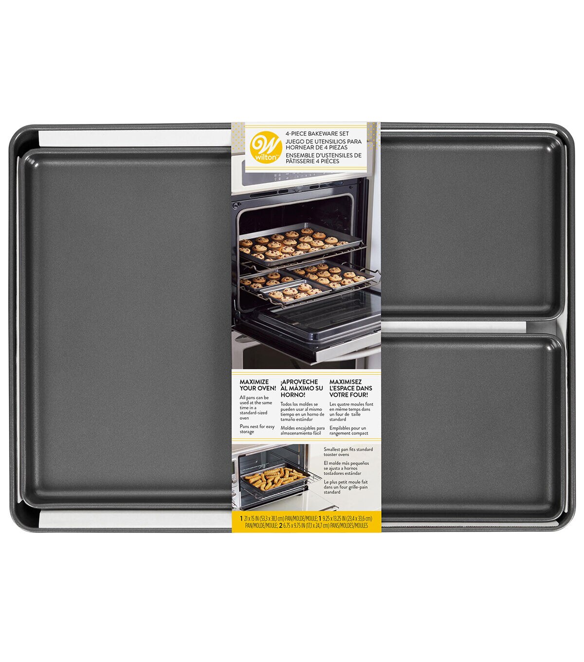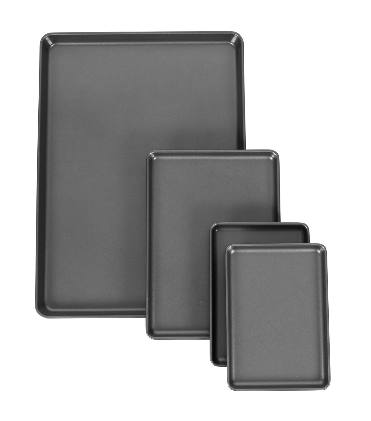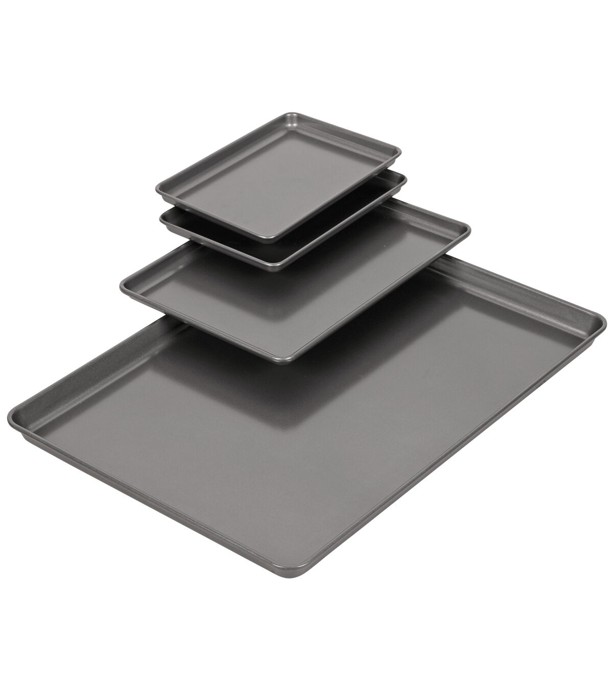 Make the most of your oven space! This handy 4-piece set is made so that you can use all of the pans in your oven at one time. It's perfect for baking big batches of cookies or roasting different veggies, appetizers and rolls for holiday dinners. The two smaller pans are also just the right size for the toaster oven to give you maximum flexibility. They nest easily for storage, and they're all non-stick and dishwasher safe for easy cleanup. Includes one 15 x 21 inch pan, one 9.5 x 13.2 inch pan and two 6.75 x 9.75 inch pans.