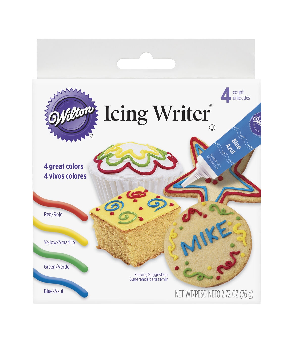 Adding a pretty decoration or special message to your cake is easy with four separate primary icing writers. Filled with ready-to-use icing, the built-in writing tip lets you write a message or add your own designs.