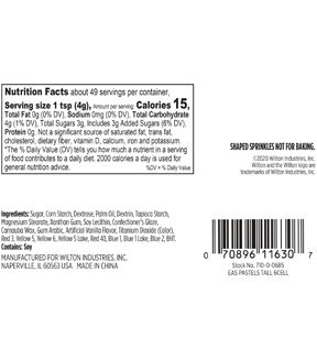 Top cakes, cookies, cupcakes and other treats with this Wilton Bright and Pastel 6-Cell Easter Sprinkles Mix. Great for Easter, spring bridal and baby showers, birthdays and more, these spring sprinkles are a fun way to add color and texture to your desserts. This mix of spring-colored sprinkles contains pink, white, yellow and mint green jimmies; mint green sanding sugar; pink, white, purple, yellow and mint green nonpareils; purple, green, blue and pink egg-shaped sprinkles; light pink sanding sugar; and purple, yellow, green, blue, pink and orange bunny-shaped sprinkles. Add them to a batch of Easter cupcakes or use them to top a bowl of ice cream or a milkshake. Each variety of sprinkle is packaged individually with its own lid, so you can use one at a time or mix and match sprinkles for a fun look.