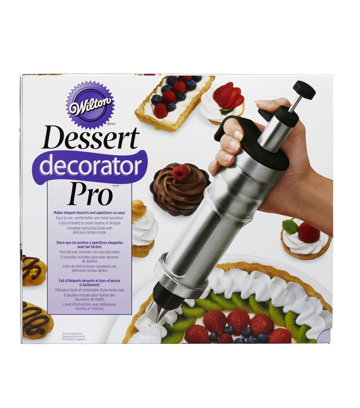 Create beautiful decorations, shells, stars, rosettes, leaves and more. The included recipe book is filled with fabulous ideas to serve your family and friends: Decorate desserts with elegant whipped cream or icing designs. Dress up pastry shells with dramatic swirls of mousse. Add sophistication to savories with pretty piped cream cheese or seafood spread decorations. With Dessert Decorator Pro¿, you can do it all! Includes 6 Durable Nickel-Plated Tips, 2 Tip Couplers (two sizes hold standard (small) and large tips), Tip/Coupler Dishwasher and Storage Bag. ©Wilton