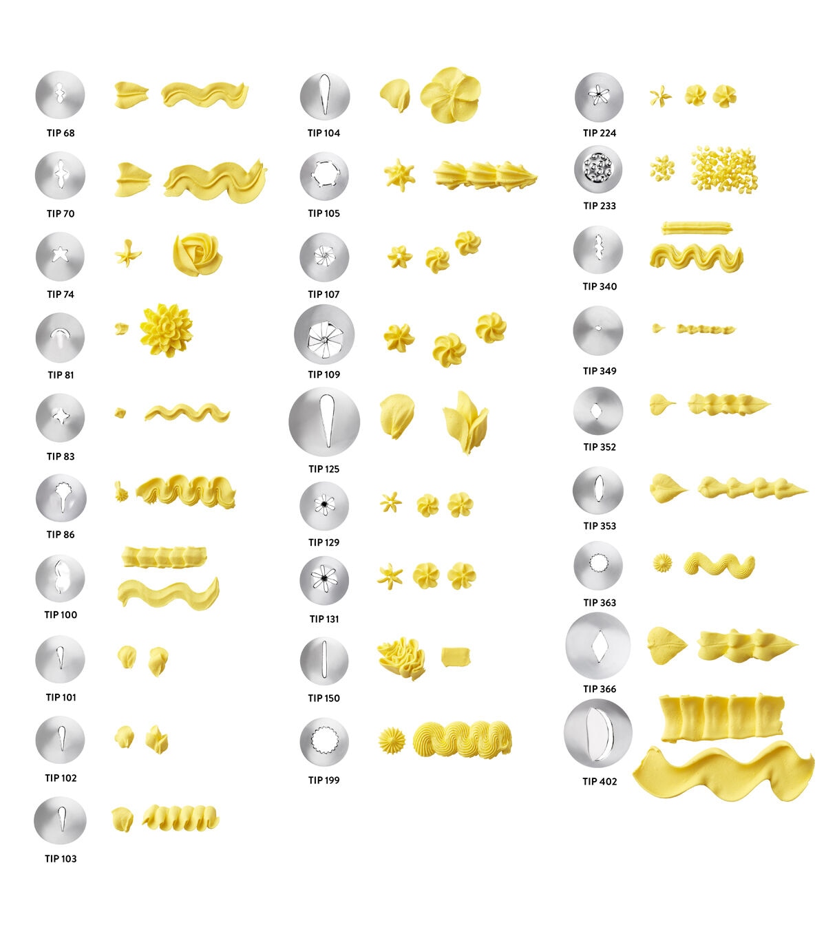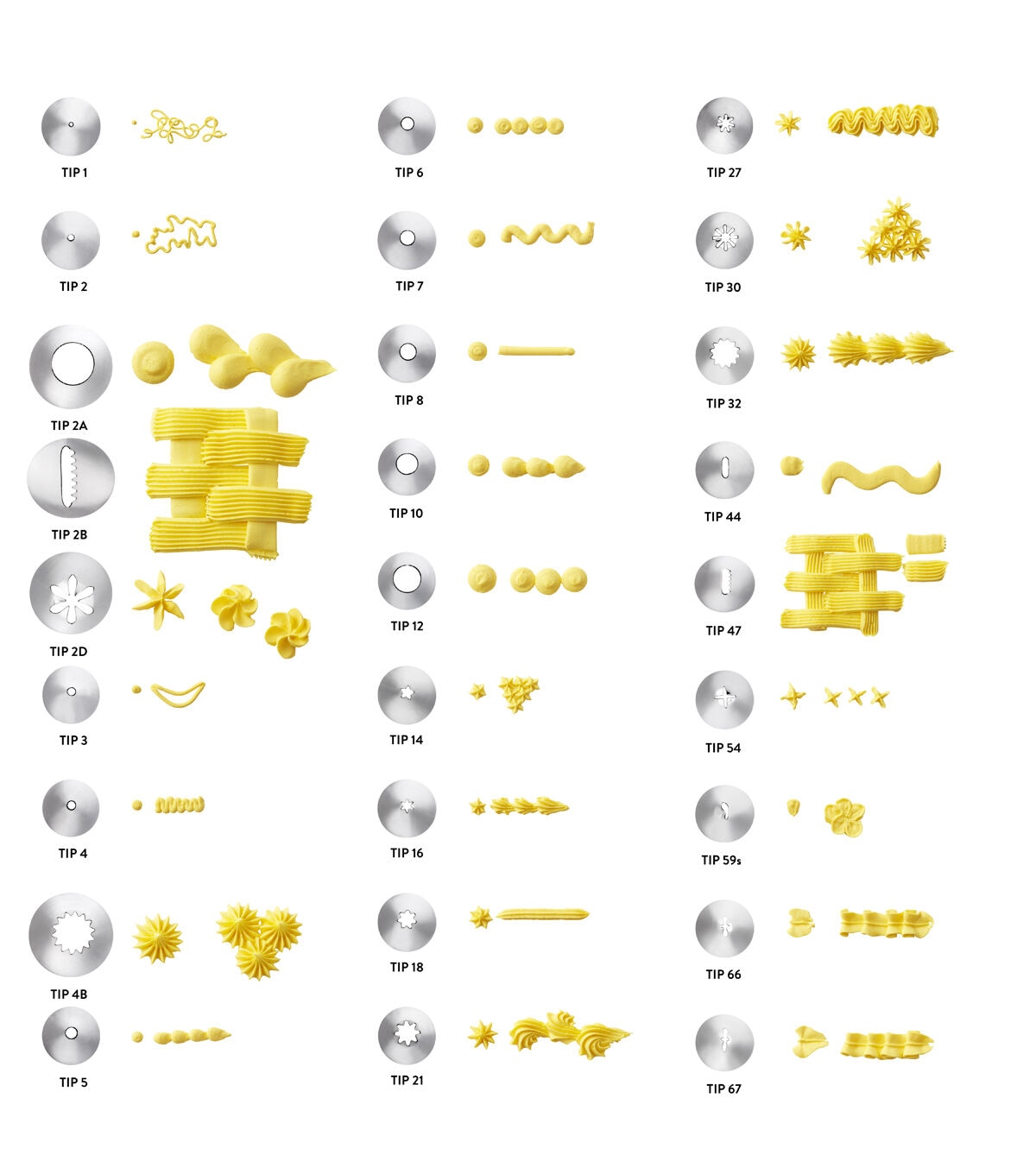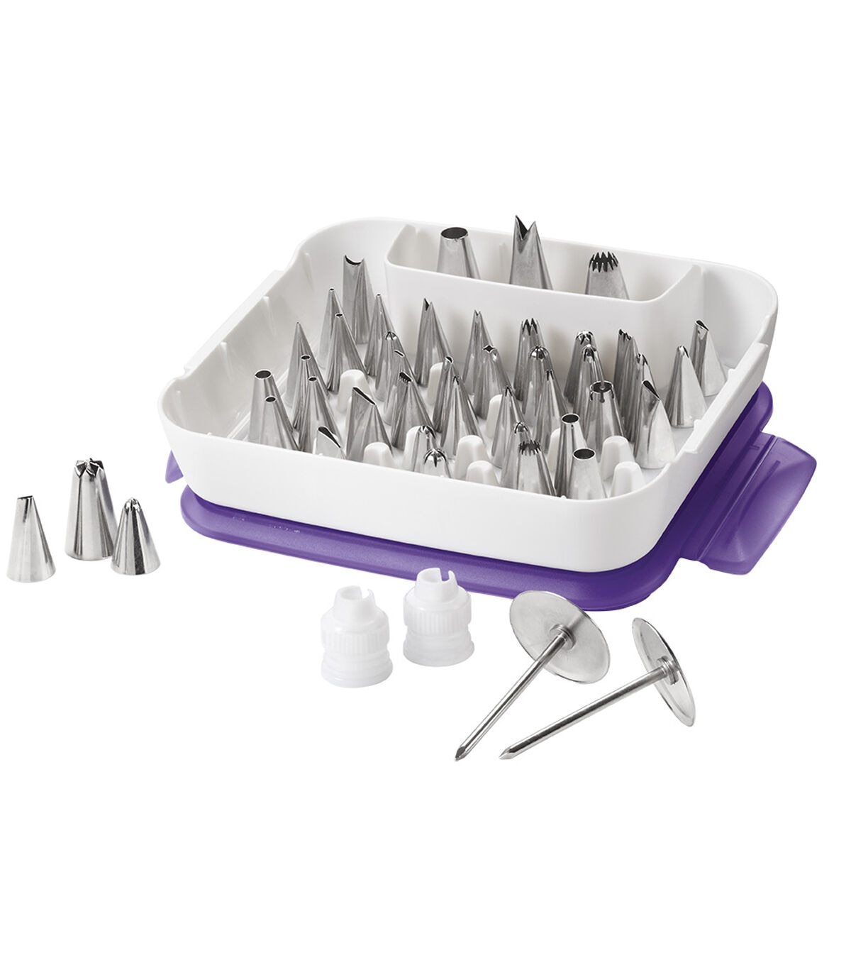 The ultimate decorating tip set includes 55 decorating tips, standard couplers and flower nails.