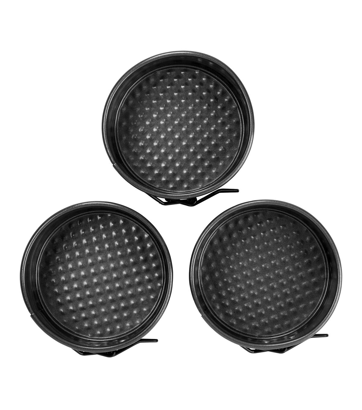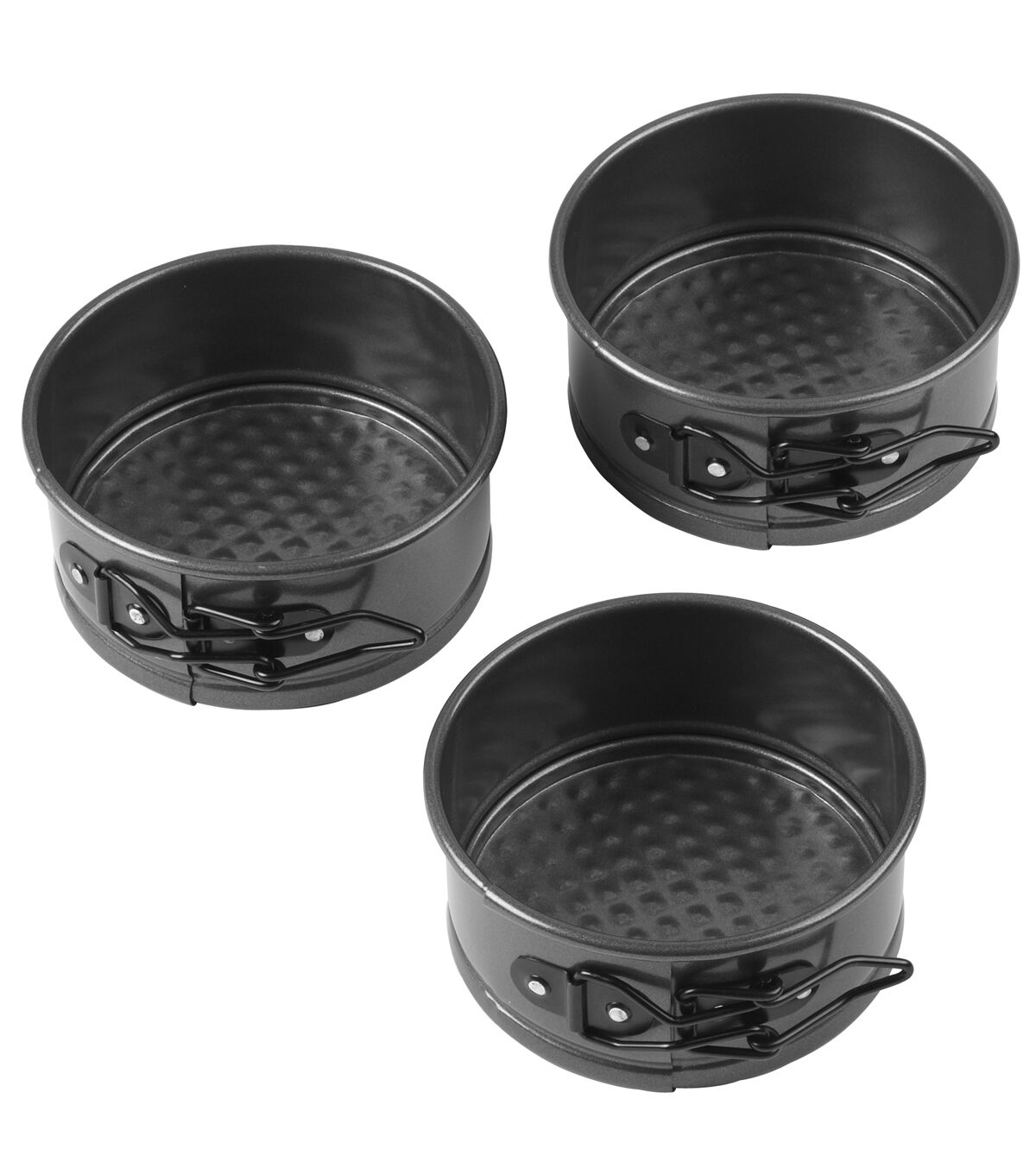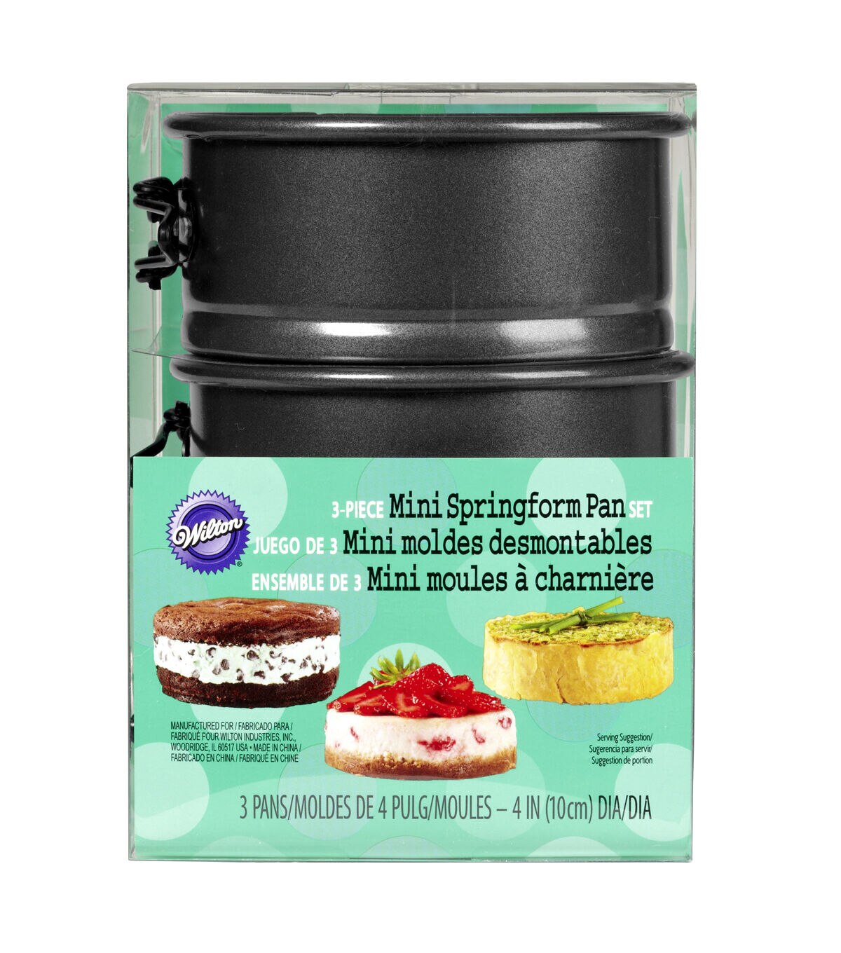 WILTON-Mini Springform Set. Use these springform pans to create delicious breads, and fun baked good creations! Each pan is round, 4 inches in diameter, and has non-stick surfaces. Pans are dishwasher safe, but it is recommended to hand wash them in warm and soapy water. This package contains three 4 inch in diameter metal pans. Imported.This product contains: Steel (Iron, Aluminum, Manganese, Phosphorus, Nickel Alloy). For more information about the chemicals in this product, visit/Para más informacíon sobre los químicos en este producto visite https://wilton.com/california-ab-1200/.
