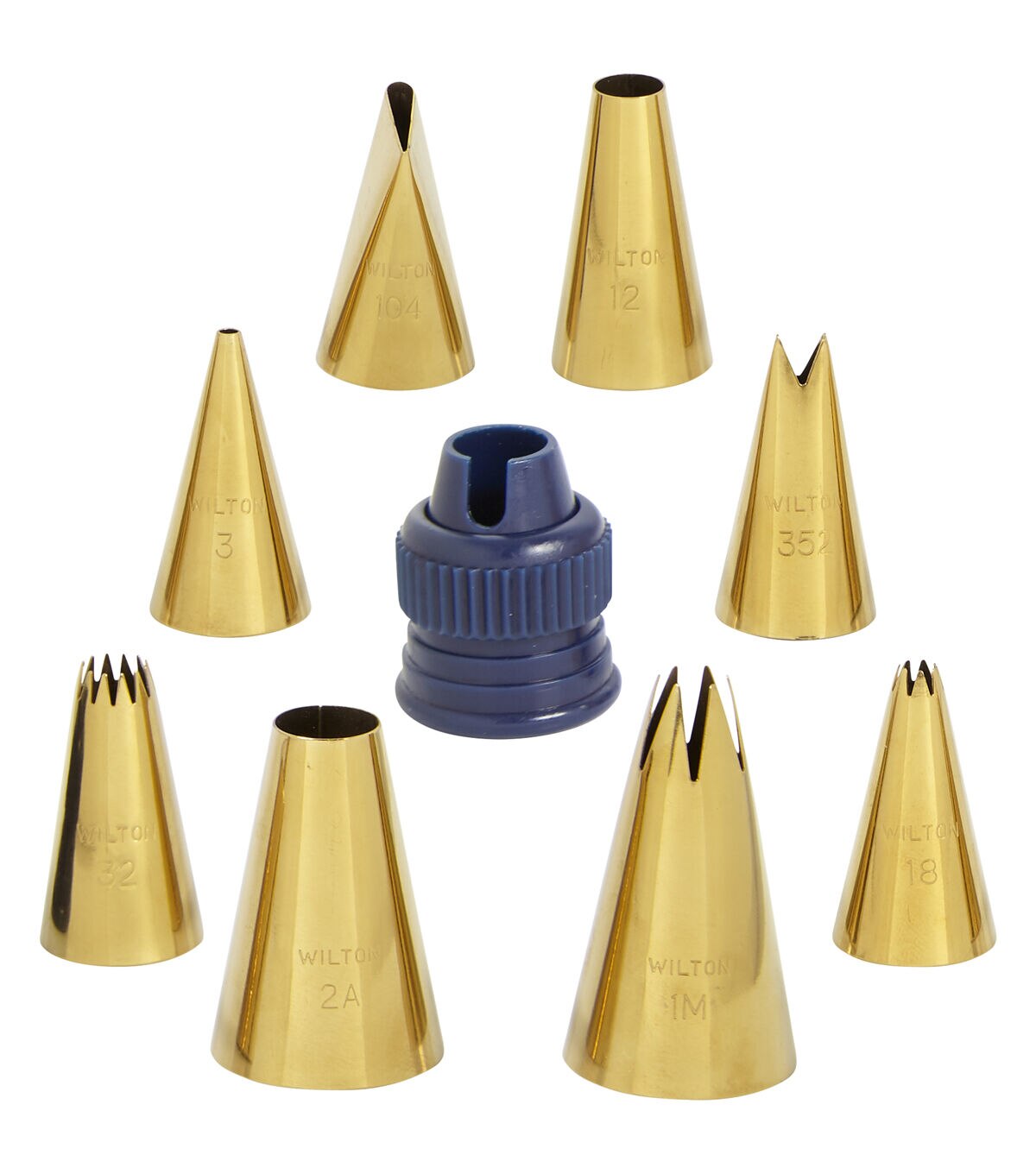 These are the reliable and dependable stainless steel cake decorating tips you know and love – now in gorgeous gold! You’ll feel delighted every time you use these tips to decorate everything from a simple swirl to more detailed cake decorations. This set is a beautiful starter or start-over set for anyone who enjoys baking and sweet treat decorating. The set comes with round tips 2A, 12, and 3; star tips 1M, 32, and 18; petal tip 104 and leaf tip 352, plus 8 disposable decorating bags, 1 navy blue standard coupler and instructions.