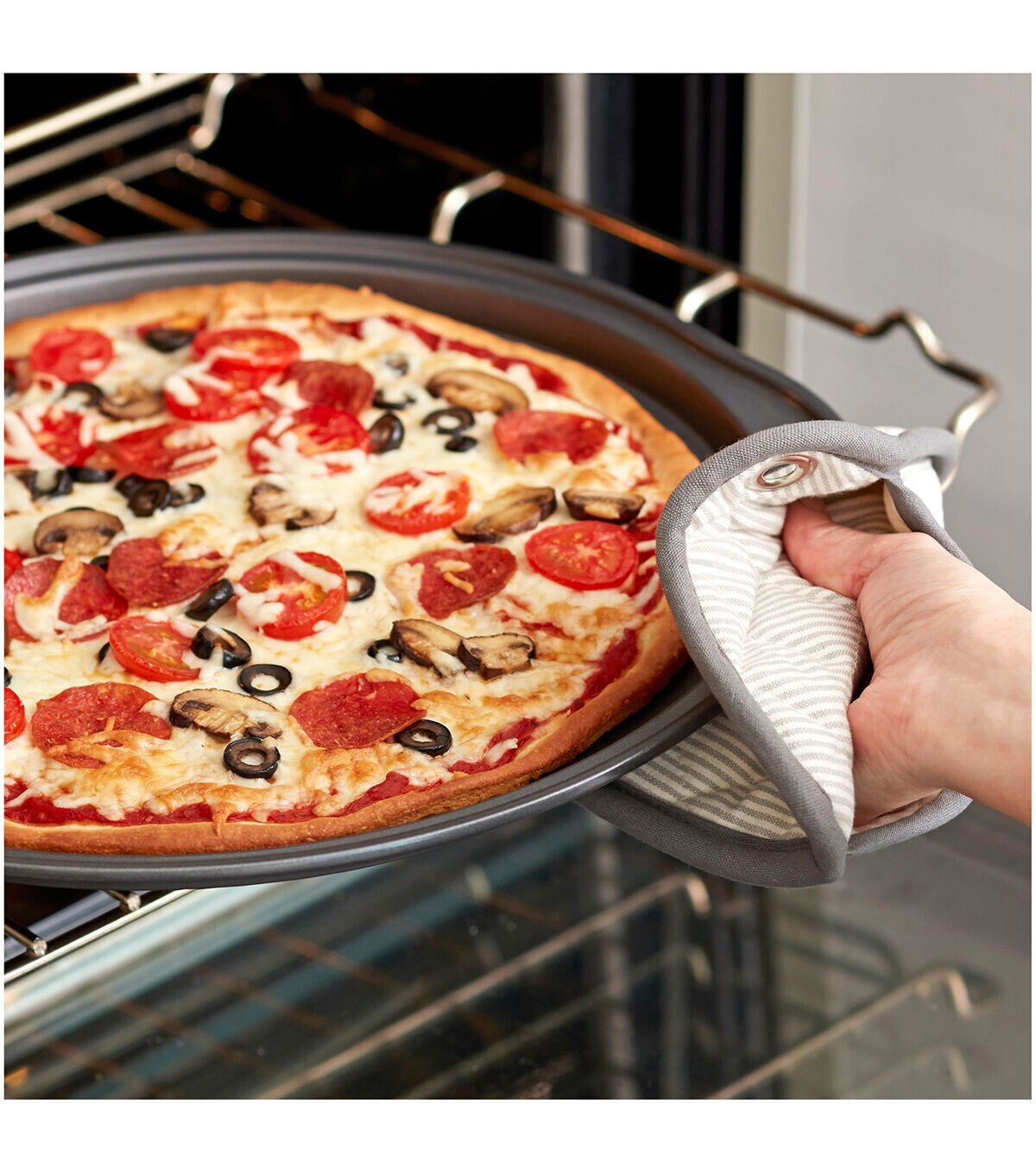 - Round steel non-stick pan with perforated holes lets air flow through, side handles make it easy to go to and from the oven