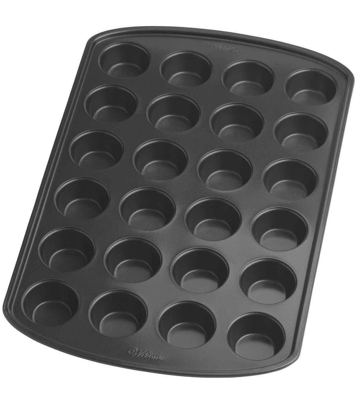 Perfect Results premium bakeware is built with all the right qualities for better baking results. Heavy-gauge construction spreads heat evenly and prevents warping. The non-stick surface features a reinforced coating that provides quick release and easy clean-up. Convenient handles are designed for easy handling in and out of the oven--even while wearing oven mitts. The handles also have the pan dimensions embossed on them for quick and easy reference. This package contains one mini cupcake pan with twenty-four cavities.
