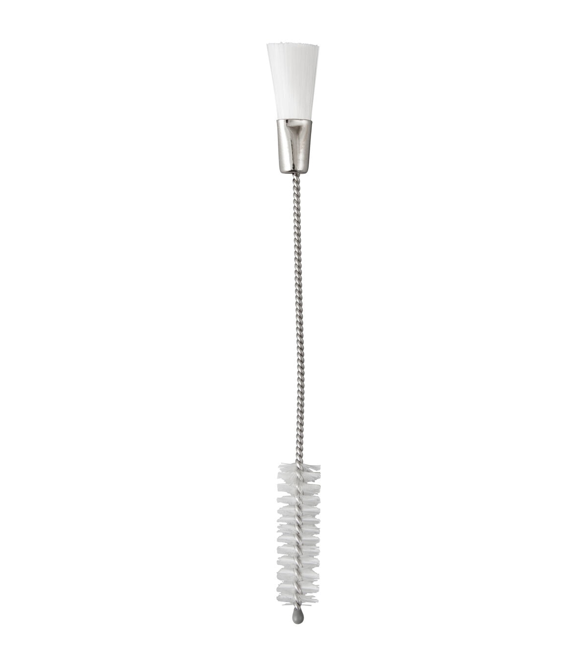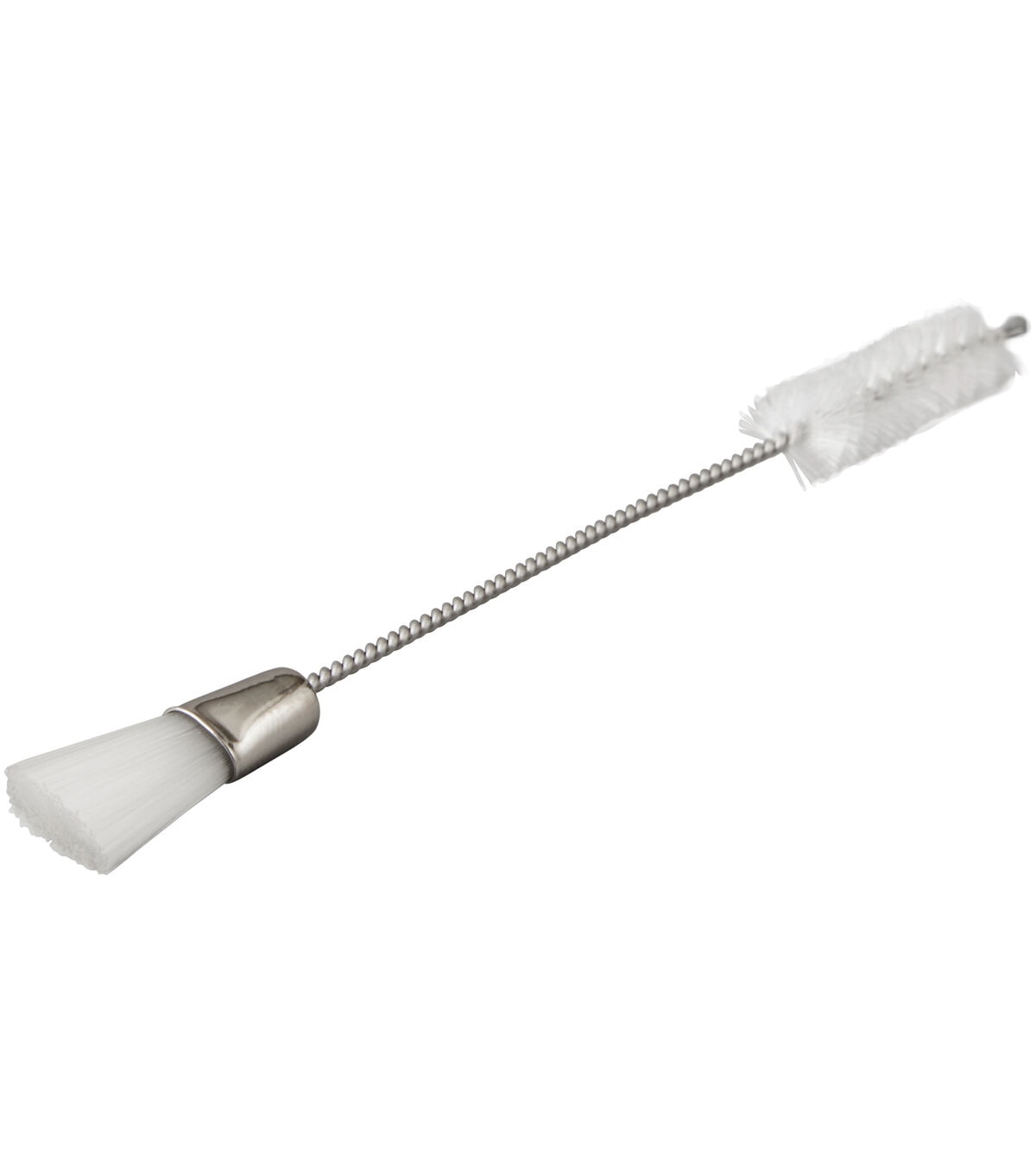 Cleaning frosting out of your decorating tips just got easier with this dual-ended brush. Use the spiral end to brush away dried icing from inside your tips and use the smooth bristles to dust away any excess on the outsides. Steel with synthetic bristles.