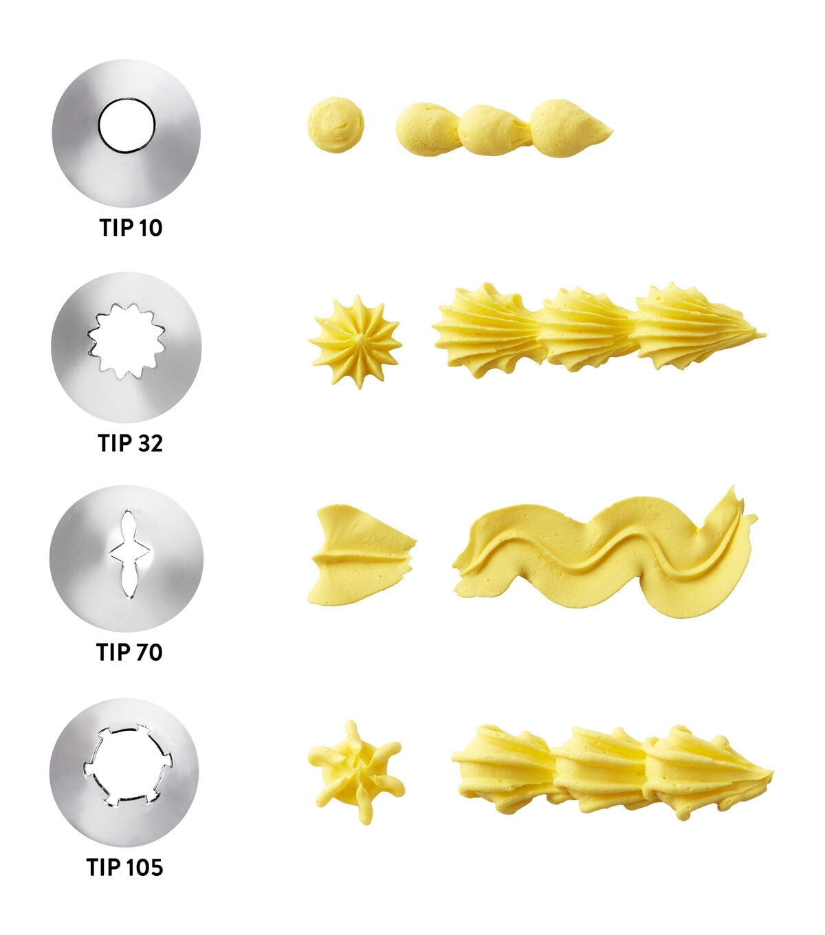 - Includes round decorating tip 10; leaf decorating tip 70; star decorating tips 32 and 105