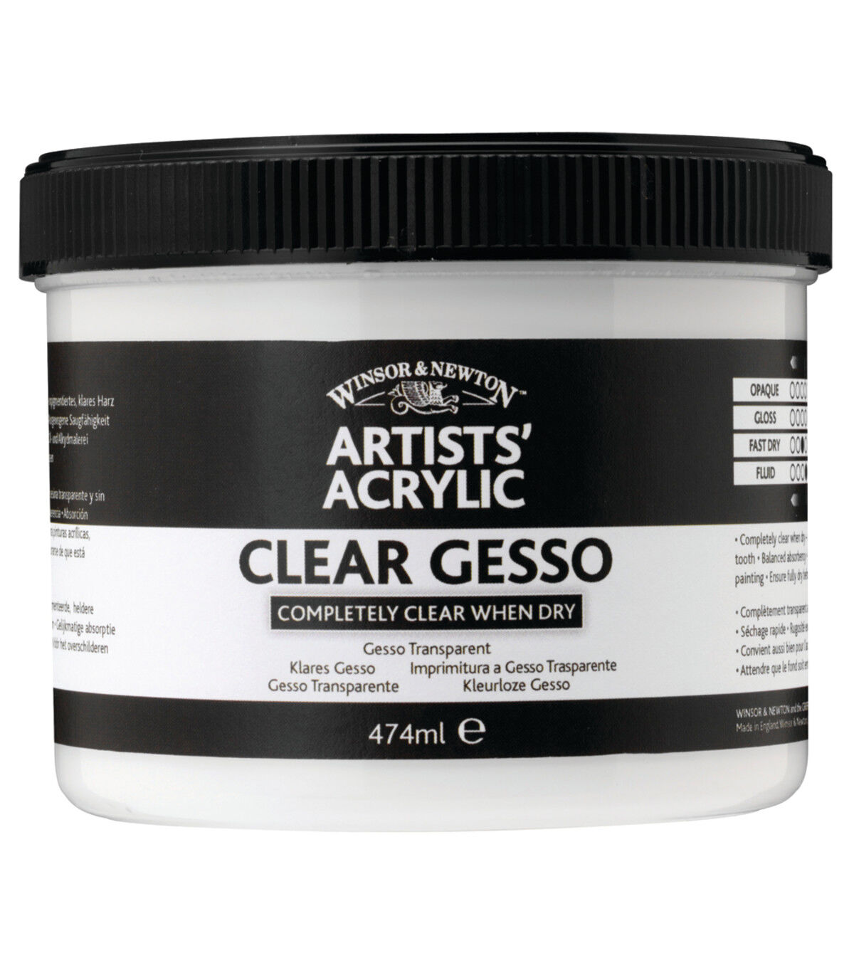 Made from unpigmented clear resin, this gesso provides excellent tooth and dries completely clear. You can make your own colored gesso primers by the addition of acrylic colors. It dries to a ground suitable for acrylic, oil and alkyd painting and for making a pastel surface on paper.