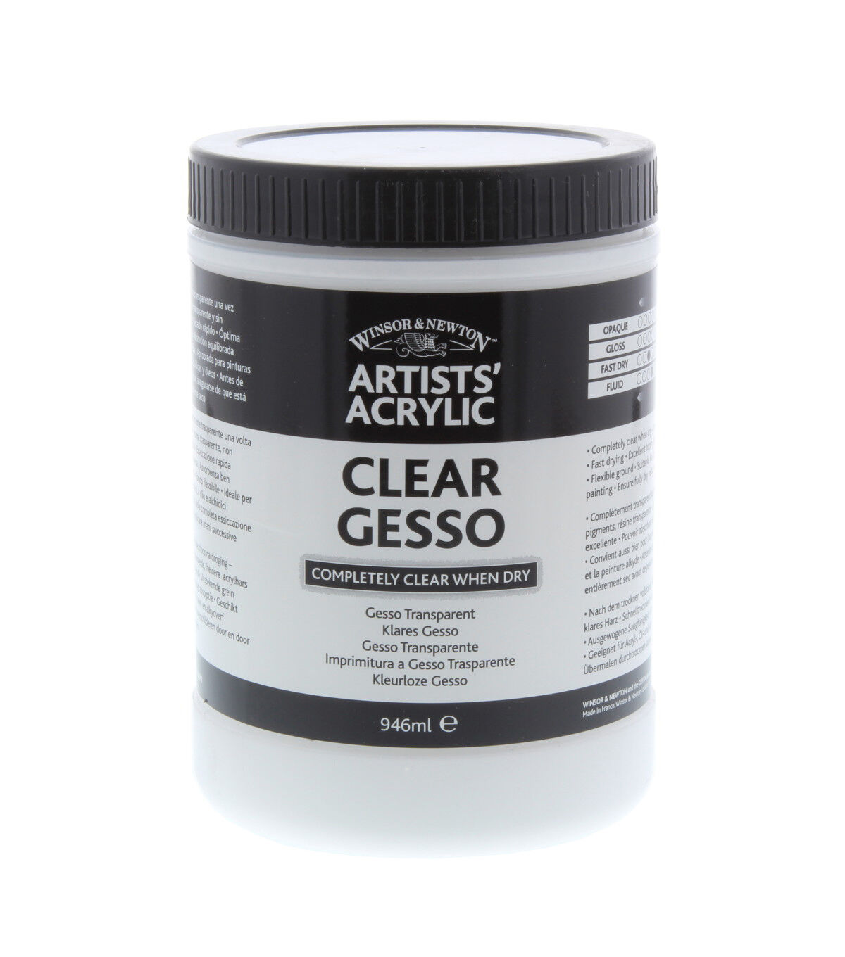 Made from unpigmented clear resin, this gesso provides excellent tooth and dries completely clear. You can make your own colored gesso primers by the addition of acrylic colors. It dries to a ground suitable for acrylic, oil and alkyd painting and for making a pastel surface on paper.