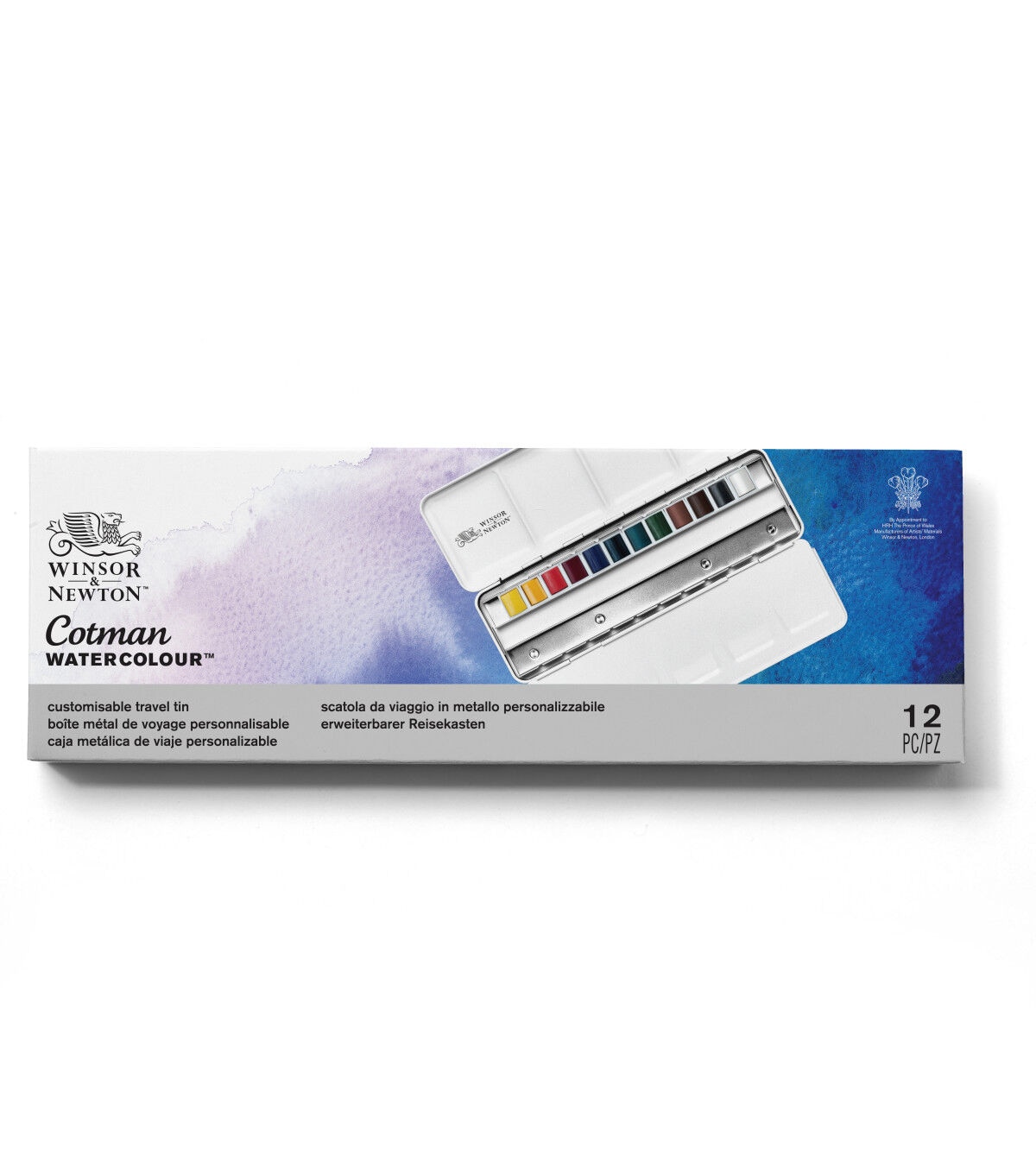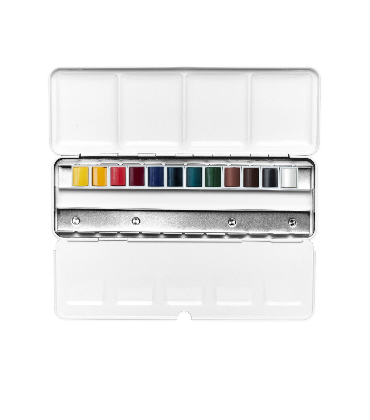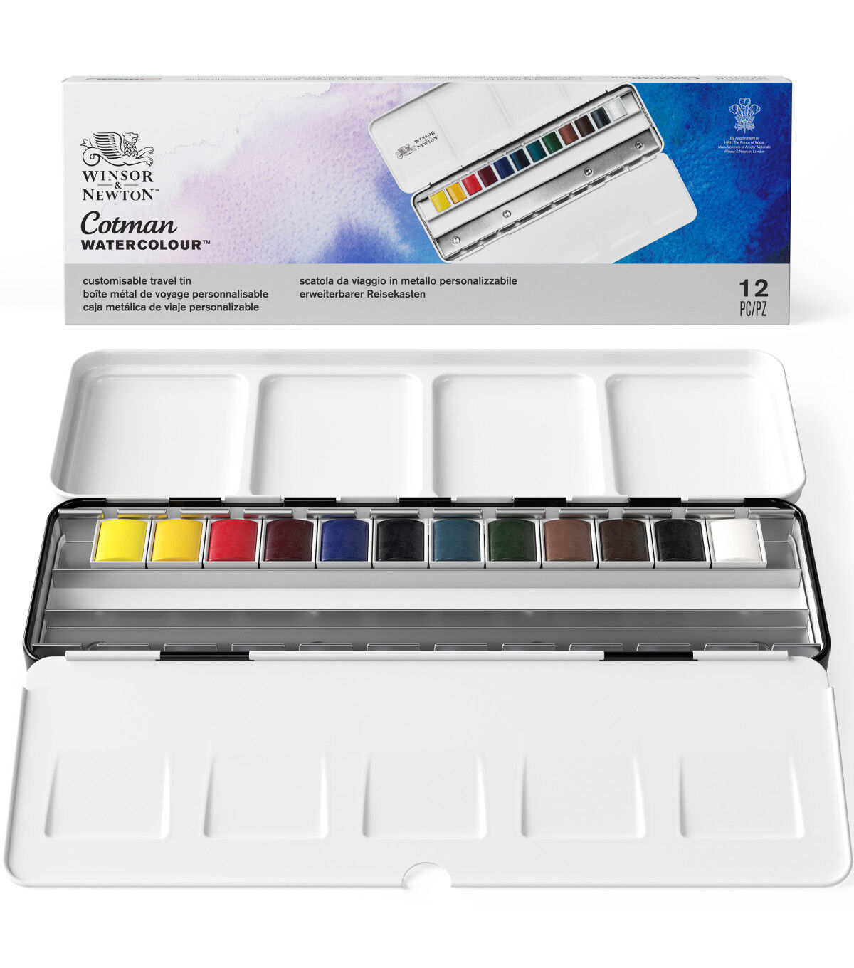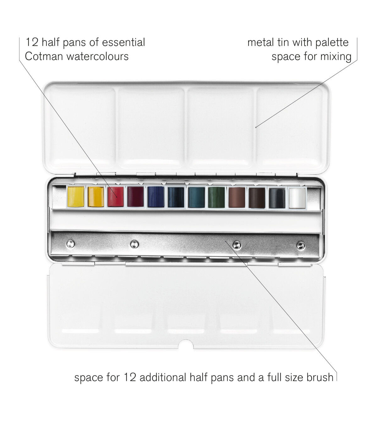 This light-weight dark blue metal box contains 12 assorted Cotman Watercolor half pans with space for 12 additional half pans. Each of the 12 assorted colors has been chosen in conjunction with each other, for a color range that allows the cleanest mixing of the whole color spectrum. The robust metal box has a mixing palette integrated into the lid and a removable palette to help simplify cleaning. This set includes lemon yellow, cadmium yellow, cadmium red, permanent rose, ultramarine, prussian blue, emerald green, permanent sap green, yellow ochre, Indian red, burnt umber and lamp black.