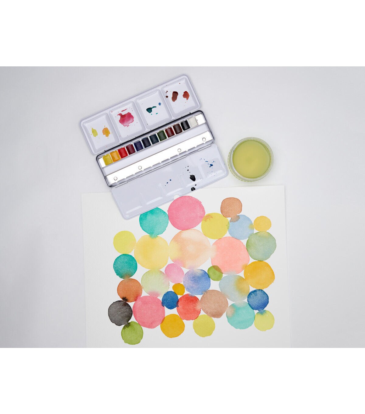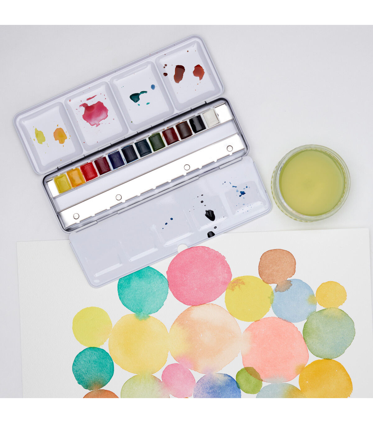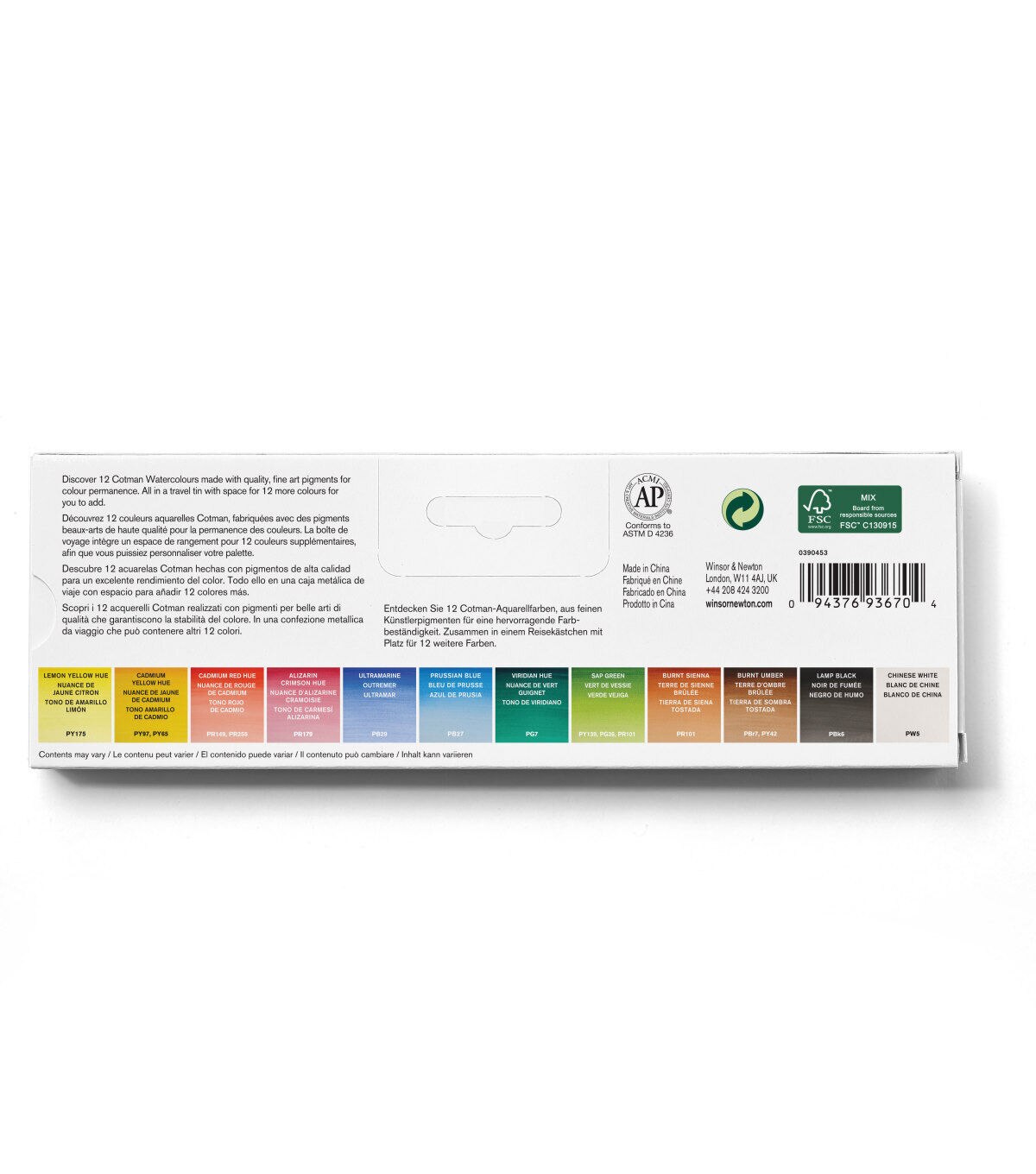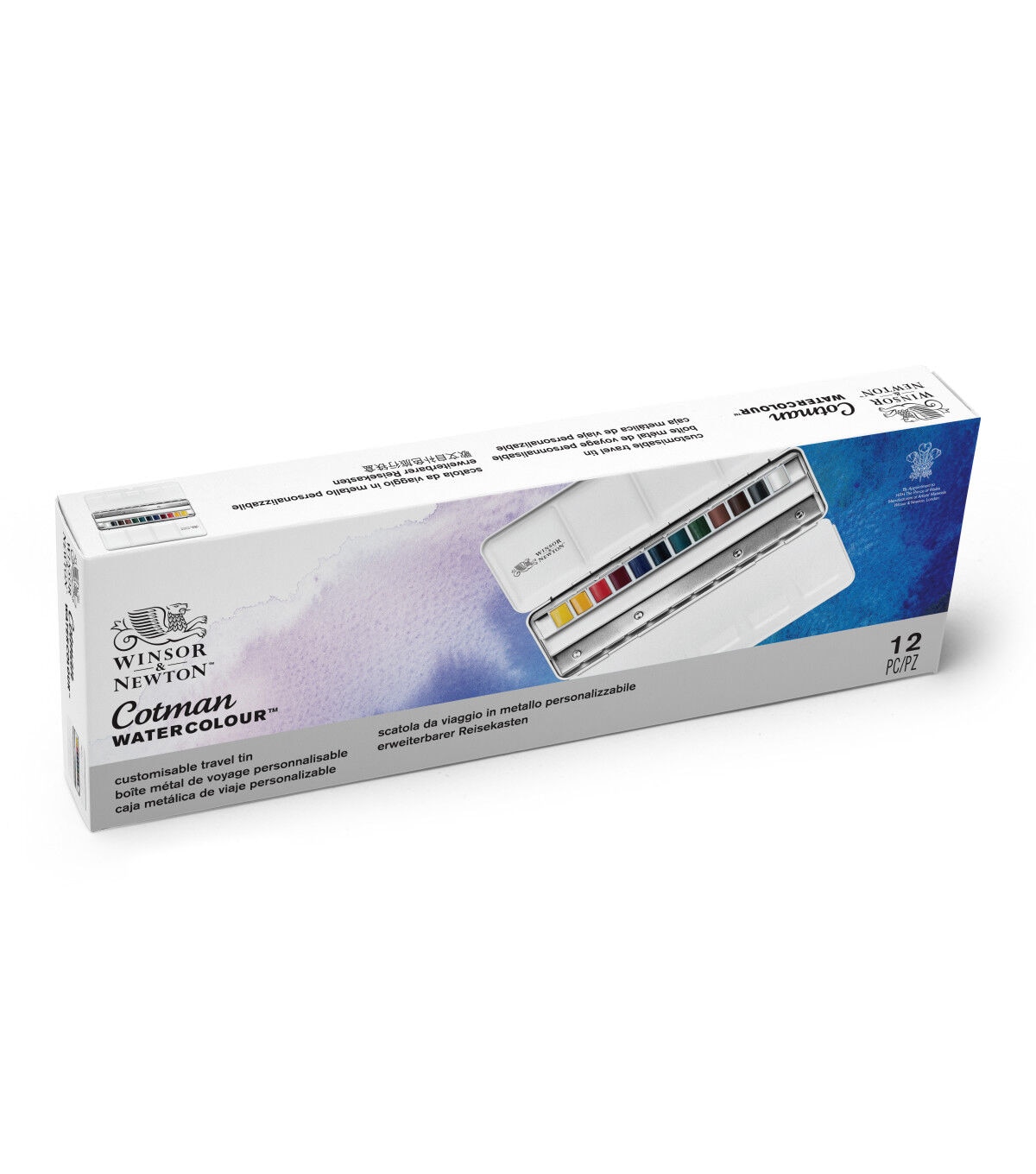 This light-weight dark blue metal box contains 12 assorted Cotman Watercolor half pans with space for 12 additional half pans. Each of the 12 assorted colors has been chosen in conjunction with each other, for a color range that allows the cleanest mixing of the whole color spectrum. The robust metal box has a mixing palette integrated into the lid and a removable palette to help simplify cleaning. This set includes lemon yellow, cadmium yellow, cadmium red, permanent rose, ultramarine, prussian blue, emerald green, permanent sap green, yellow ochre, Indian red, burnt umber and lamp black.