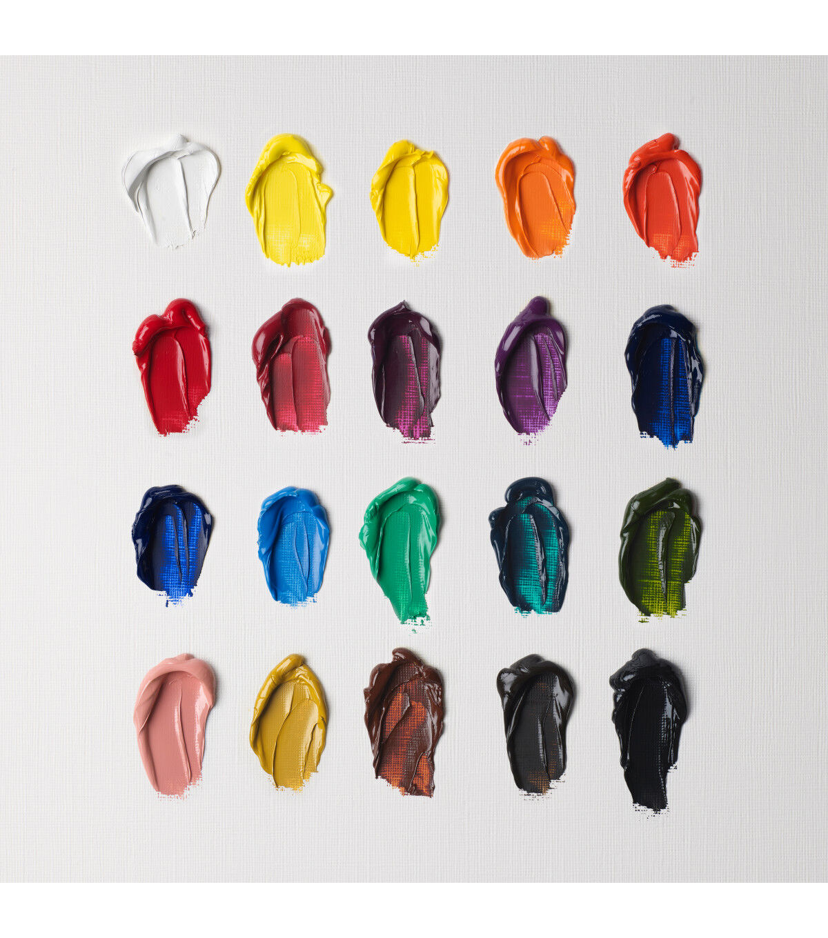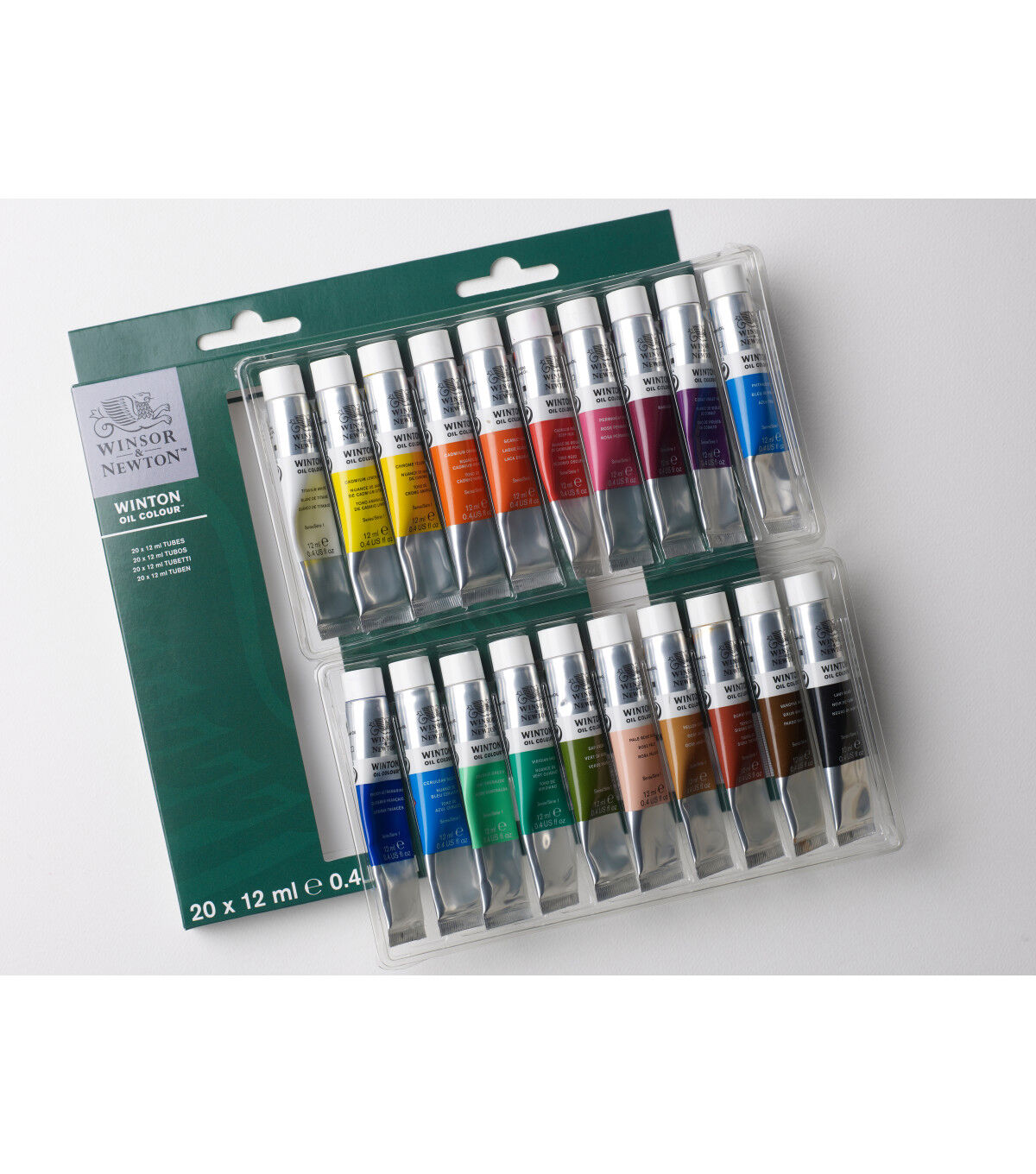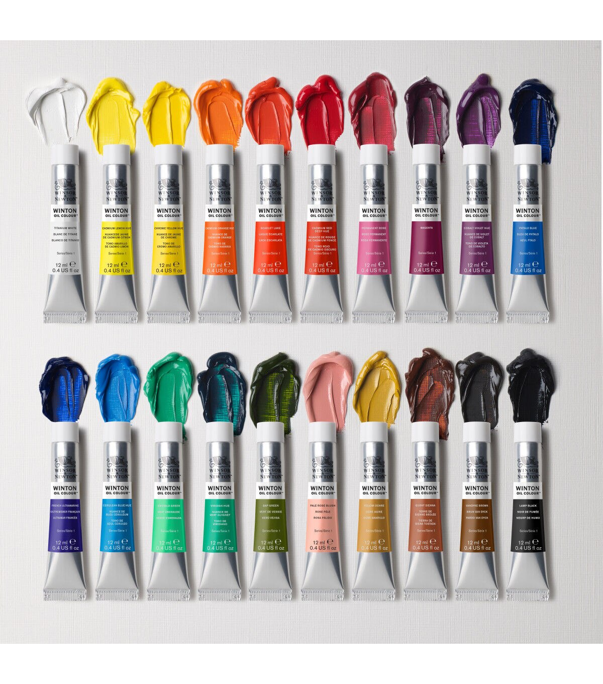 The Introduction to Fine Art 20-Color Set includes titanium white, cadmium lemon hue, chrome yellow hue, cadmium orange hue, scarlet lake, cadmium red deep hue, permanent rose, magenta, cobalt violet hue, phthalo blue, French ultramarine, cerulean blue hue, emerald green, viridian hue, sap green, pale rose bush, yellow ochre, burnt sienna, vandyke brown and lamp black in 12ml tubes.