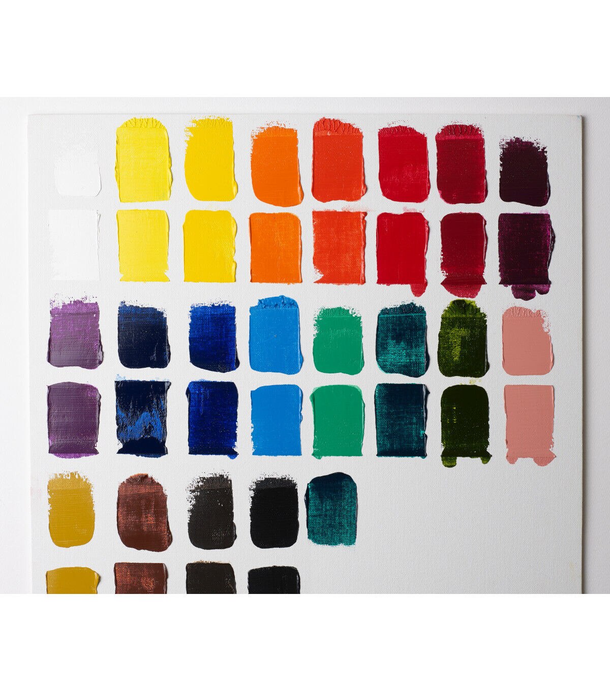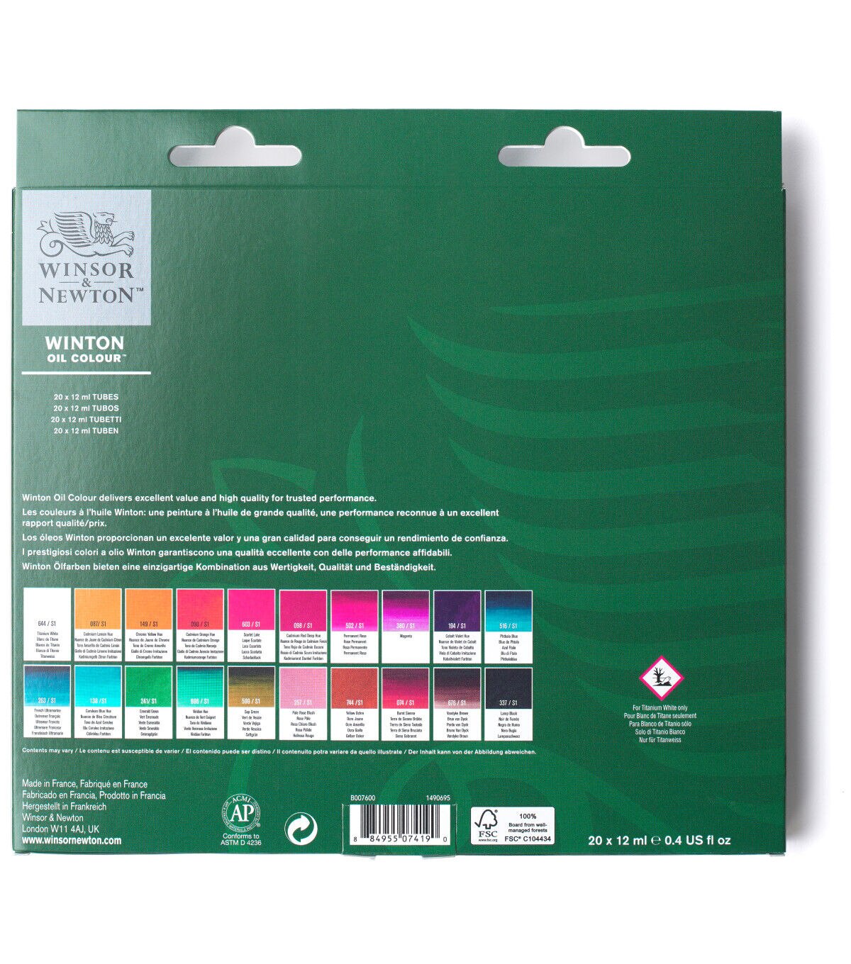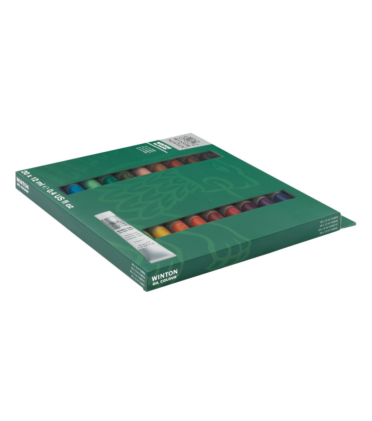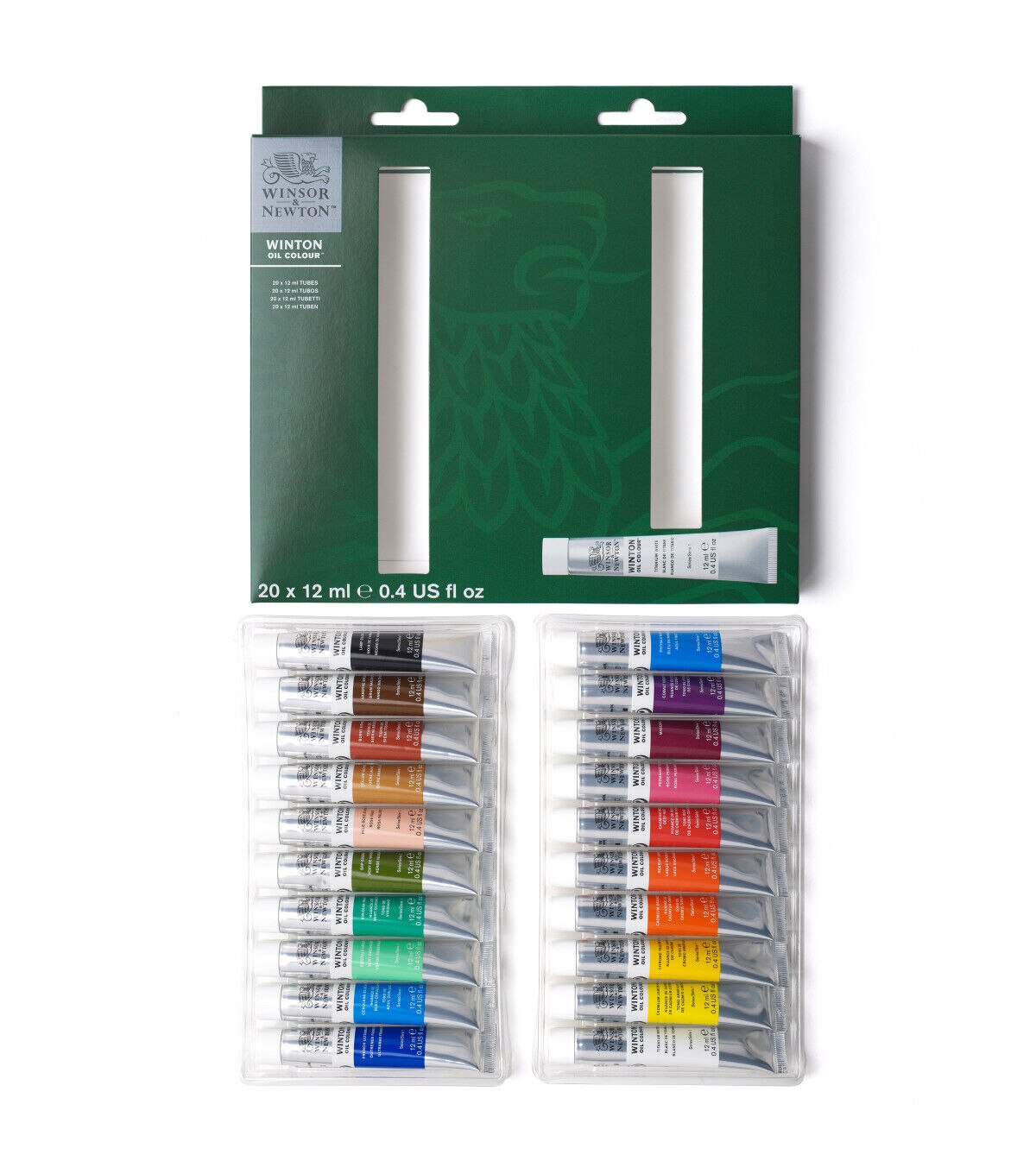 The Introduction to Fine Art 20-Color Set includes titanium white, cadmium lemon hue, chrome yellow hue, cadmium orange hue, scarlet lake, cadmium red deep hue, permanent rose, magenta, cobalt violet hue, phthalo blue, French ultramarine, cerulean blue hue, emerald green, viridian hue, sap green, pale rose bush, yellow ochre, burnt sienna, vandyke brown and lamp black in 12ml tubes.