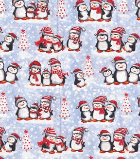 Get Cozy with Winter Penguin Friends on Blue Christmas Glitter Cotton Fabric