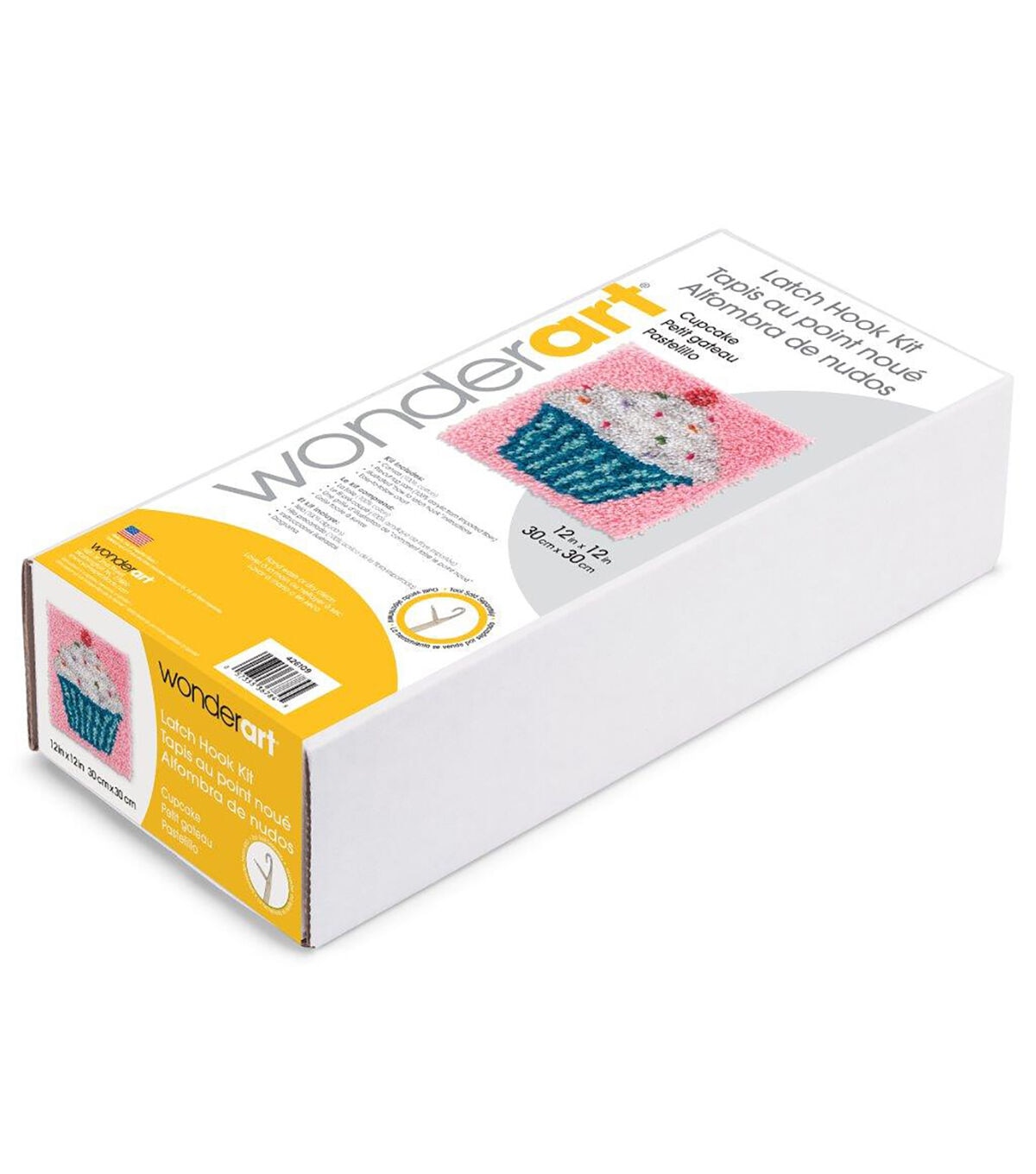 CARON-Wonderart: Latch Hook Kit. This kit will give you a rug that is wonderfully lush and can be made to fit any decor motif. The possibilities are astounding, you can use them on the floor, wall, sofa, bed, window or even make them into pillows, nap-mats and seat cushions. They are easy to make, it would be a wonderful family project! This kit contains a 50% polyester/50% cotton canvas, pre- cut rug yarn, illustrated how to latch hook instructions and an easy-to-follow chart. Hook tool and binding materials are not included. Size: 12x12in. Design: Cupcake. Made in USA.
