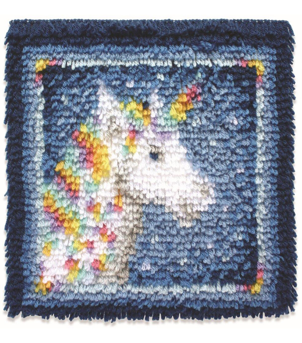 CARON-Wonderart Latch Hook Kit: Unicorn. These small kits are ideal for beginners or quick weekend projects. When finished, they can be made into table top decorations or to decorate a wall! This package includes one 12x12 inch unicorn canvas (50% polyester/50% cotton), pre-cut rug yarn (100% acrylic), illustrated instructions on how to latch a hook and one easy-to- follow chart. Latch hook tool and binding not included. Hand wash or dry clean. Made in USA.