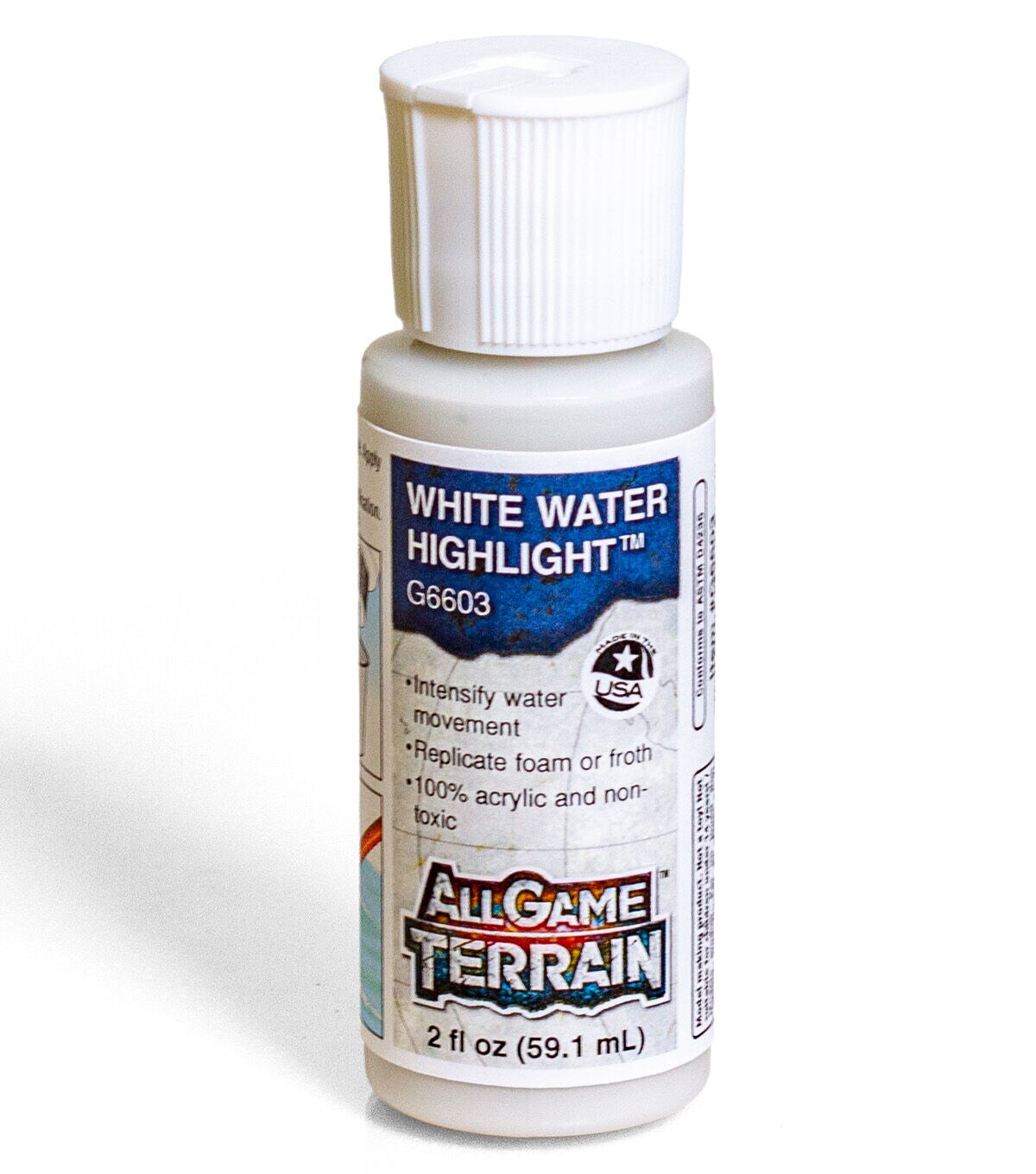 White Water Highlight is used to replicate foam or froth to a water feature on your miniature base, terrain feature or gaming board. Use to intensify movement for fast-moving water. White Water Highlight is water soluble and non-toxic.