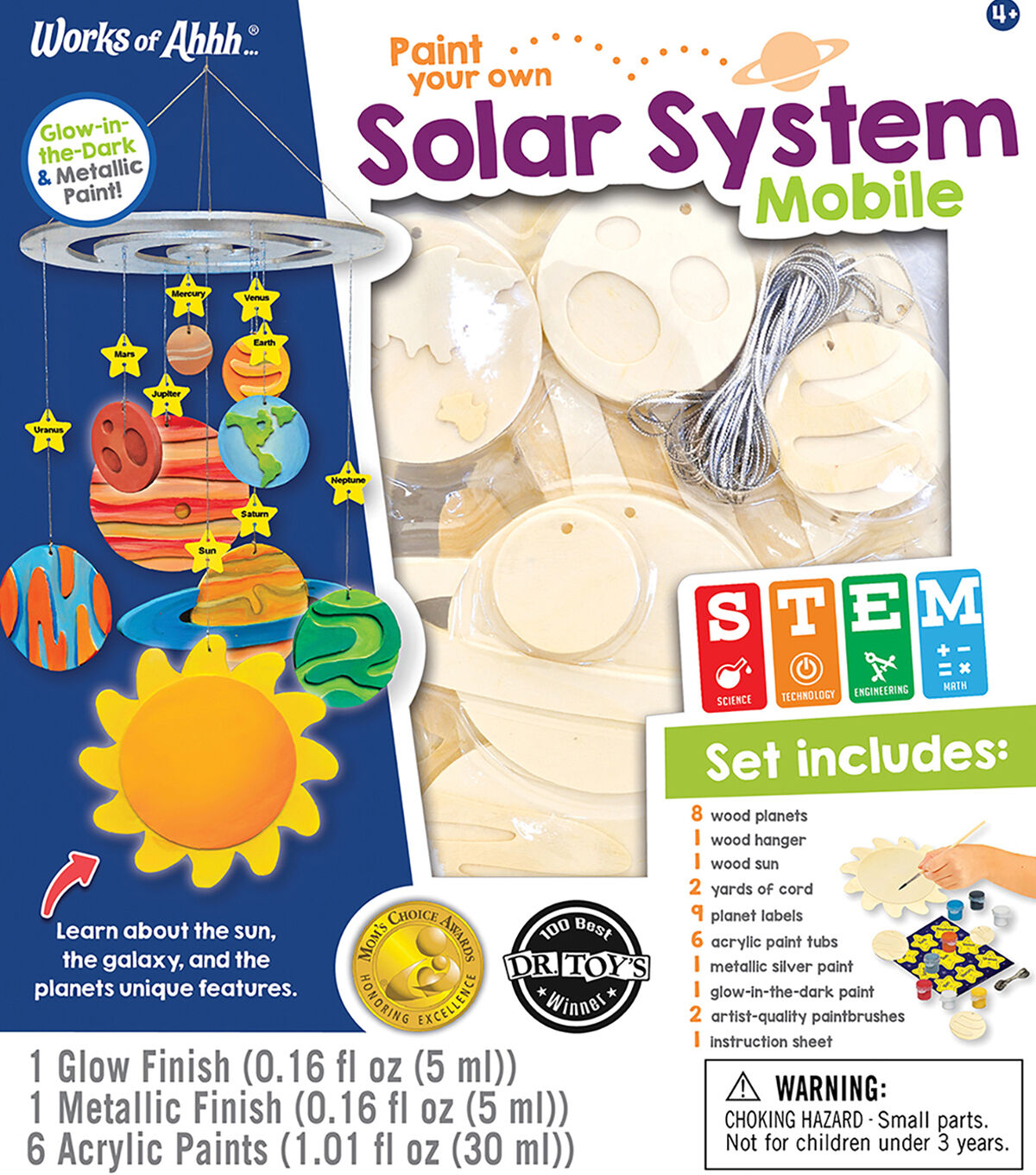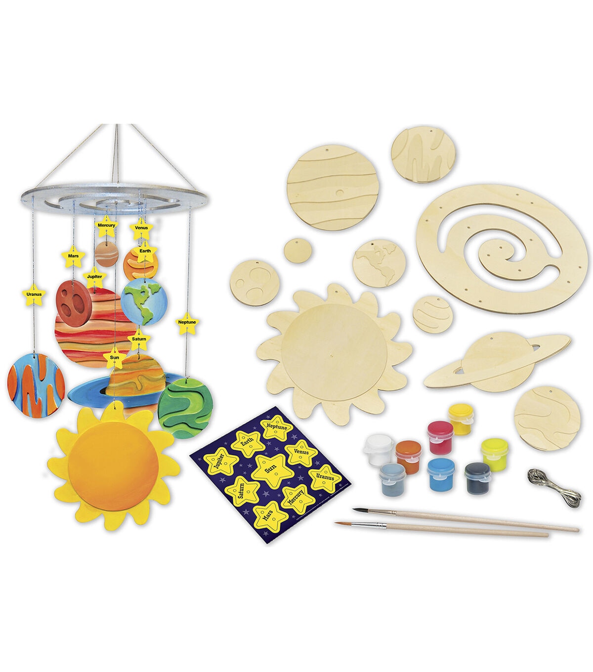 - This paint-your-own solar system mobile kit includes 8 wooden planets, 1 wooden sun, 1 wooden hanger, 5 yards of cord, 1 pop-out label sheet, 1 non-toxic glow-in-the-dark paint, 1 non-toxic metallic silver paint, 6 non-toxic acrylic paint tubs, 2 artist-quality paintbrushes, 1 instruction sheet with painting guide and fun facts.