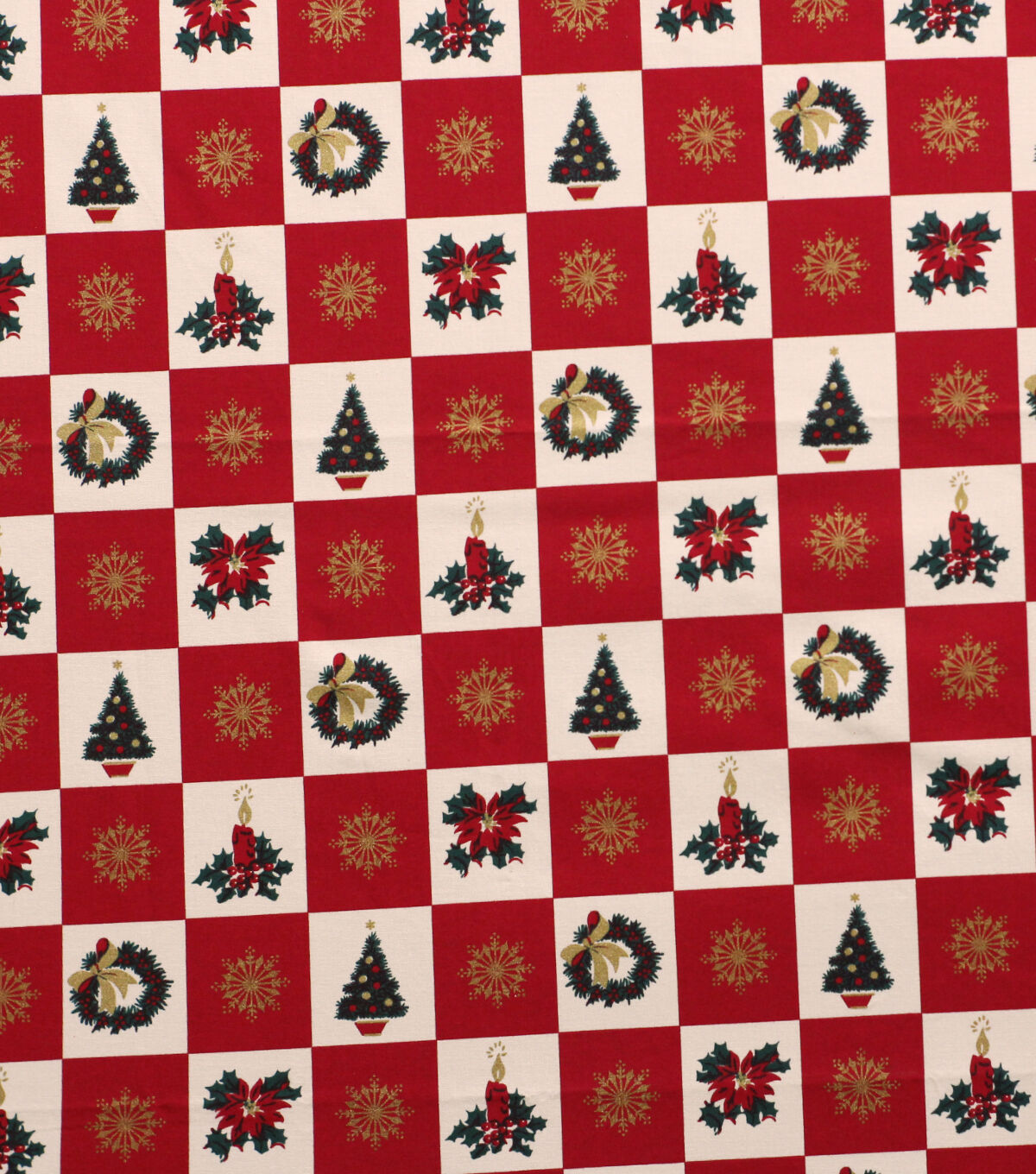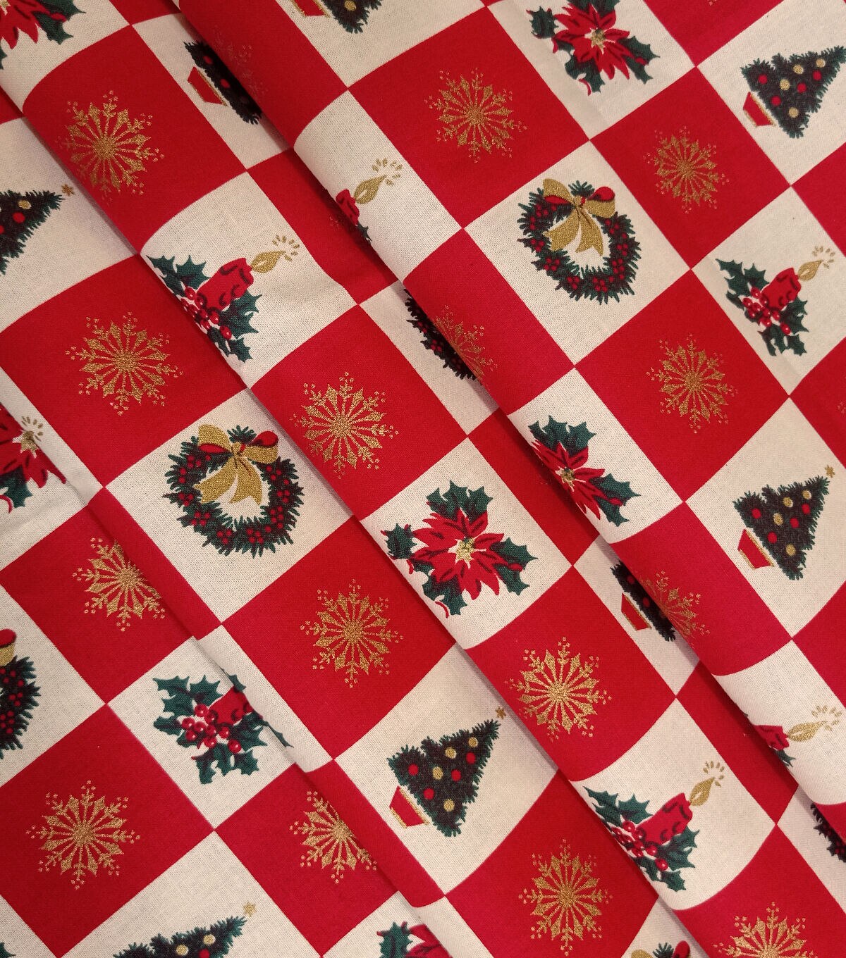Transform your home into a winter wonderland with our Wreaths & Trees on Red Checks Christmas Metallic Cotton Fabric. This fabric features a festive design of wreaths and trees on a red checkered background with metallic accents that will add a touch of sparkle to your holiday decor. Made from 100% cotton, this fabric is not only durable but also soft to the touch.