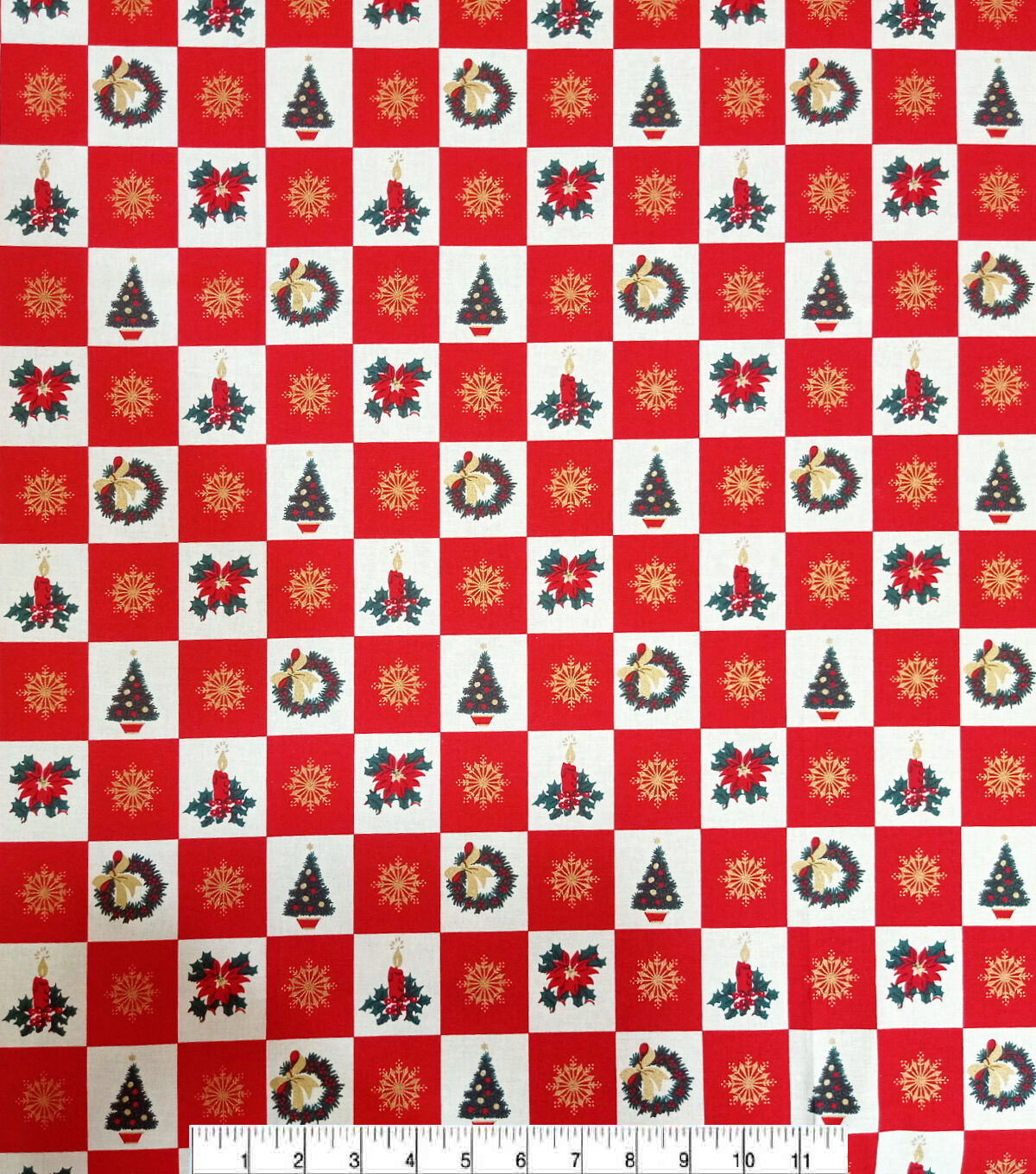 Get into the Holiday Spirit with Wreaths & Trees on Red Checks Christmas Metallic Cotton Fabric