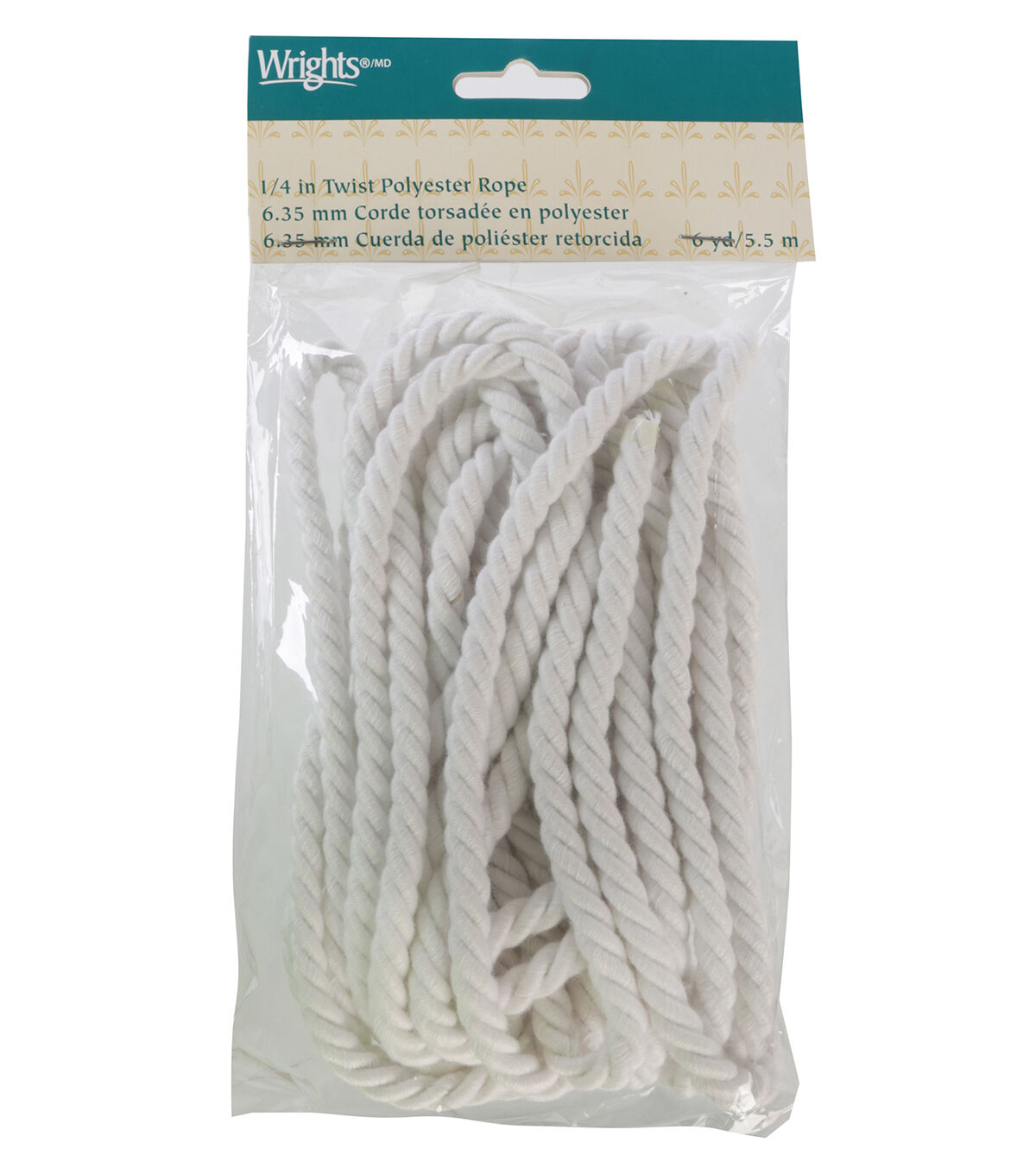 The Wrights Twist Polyester Rope - Matte White will be a valuable addition to your upholstery drapery supplies. This pack includes a twisted polyester rope that measures 0.25 inches wide and 6 yards in length. You can use this cord sporting a matt white shade for tote bags, luggage racks, basic craft applications and a lot more.