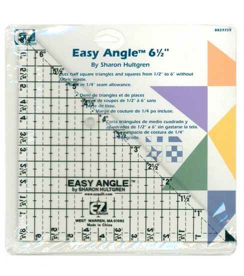 Add the EZ Quilting Sharon Hultgren Easy Angle Template to your sewing supplies. This ruler lets you cut half-square triangles and squares from 0.5 inches to 6 inches without wasting fabric. It comes with a built-in 0.25-inch seam allowance and works best with a rotary cutter.