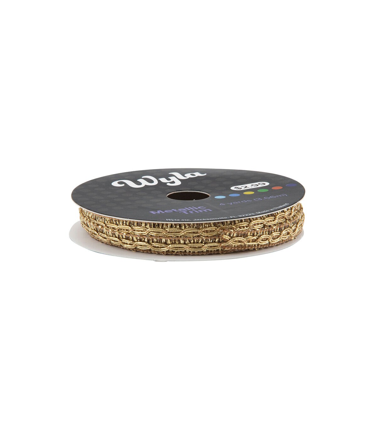 Create something unique for a loved one and decorate it with the Wyla Sew-on Middy Braid Metallic Trim-Gold. You can use this sew-on metallic trim to add detail and visual interest to a variety of sewing and craft projects.
