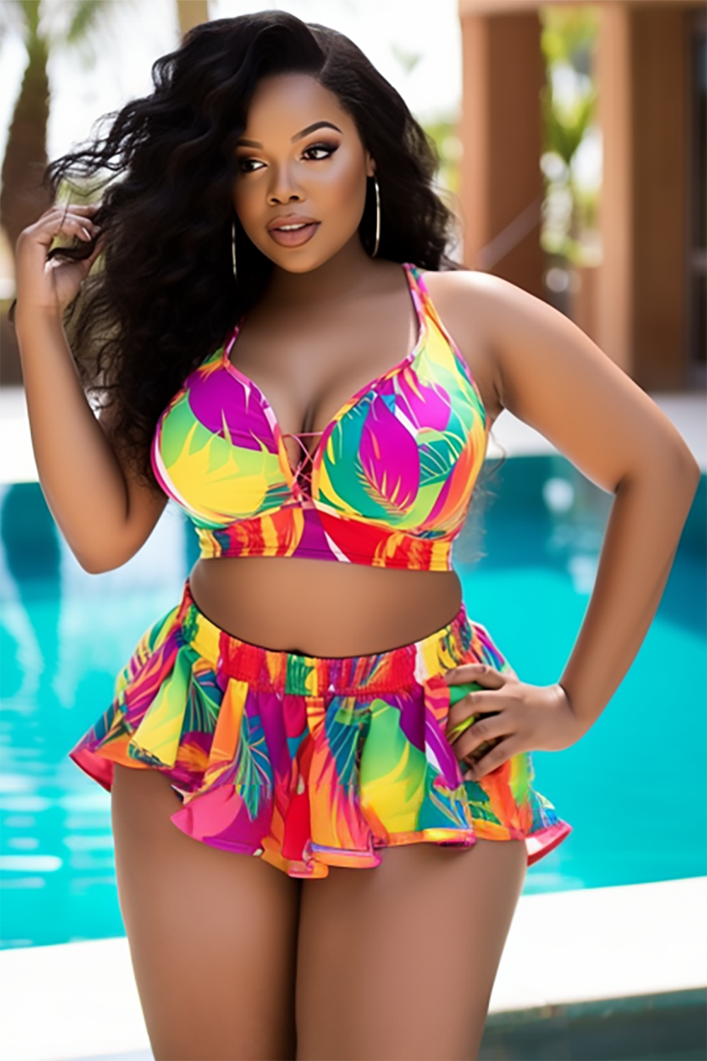• Xpluswear Design Plus Size Beach Multicolor Tropical Print Swimsuit Fabric Two Pieces Swimsuit