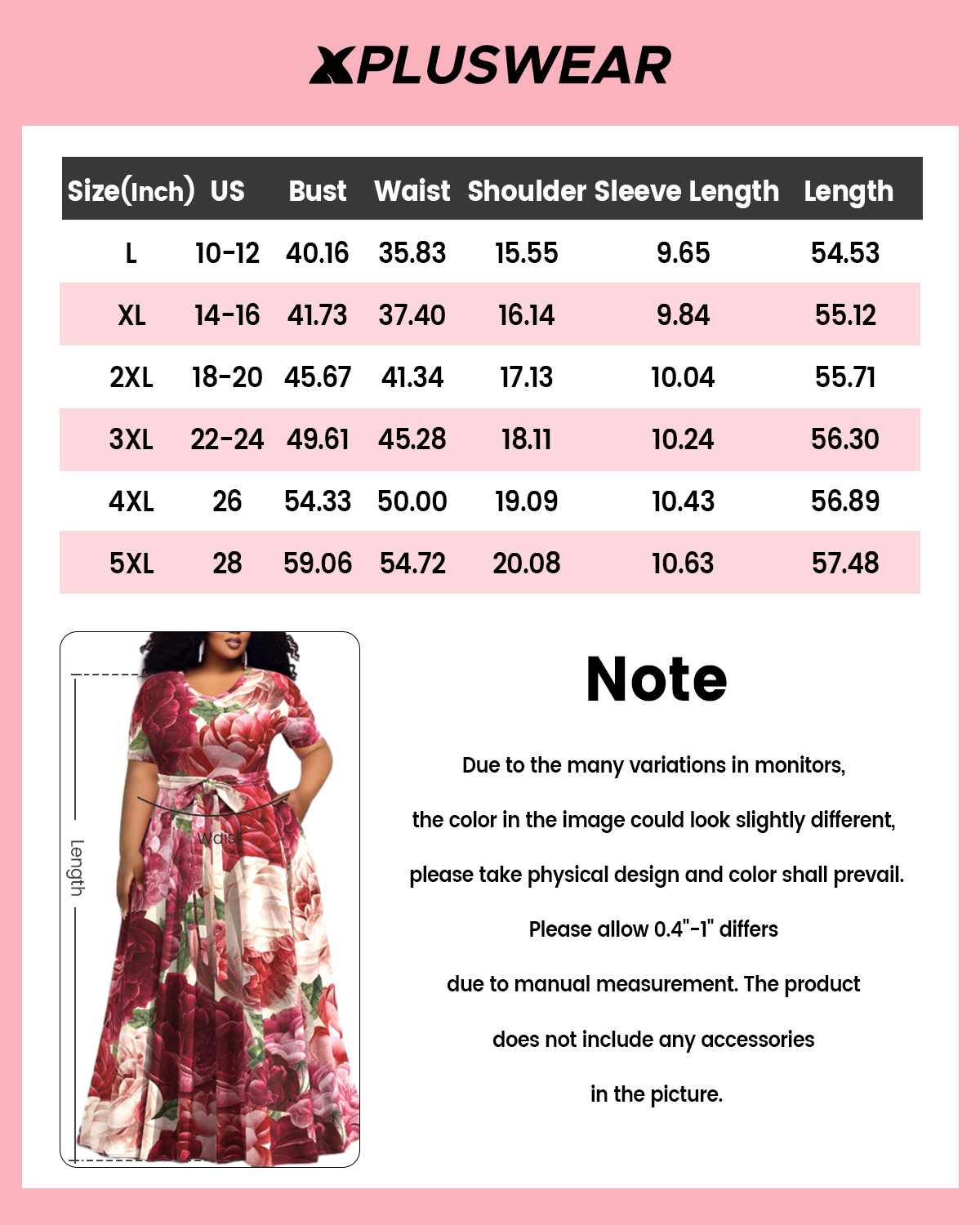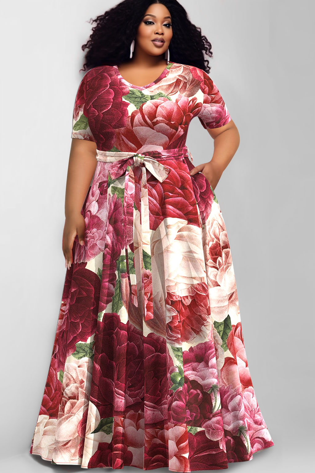 • Xpluswear Design Plus Size Burgundy Daily Floral Print Short Sleeve Pocket Maxi Dresses