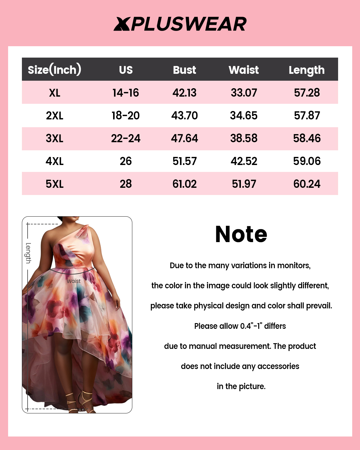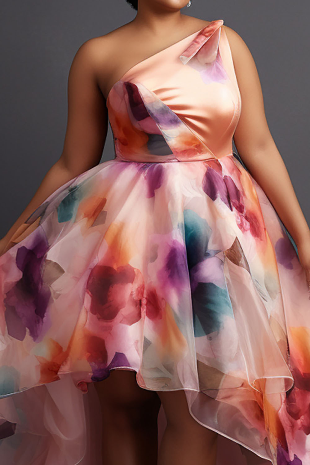 • Xpluswear Design Plus Size Semi Formal Elegant Pink Floral Oblique Collar One Shoulder Irregular Hem Tulle Maxi Dresses