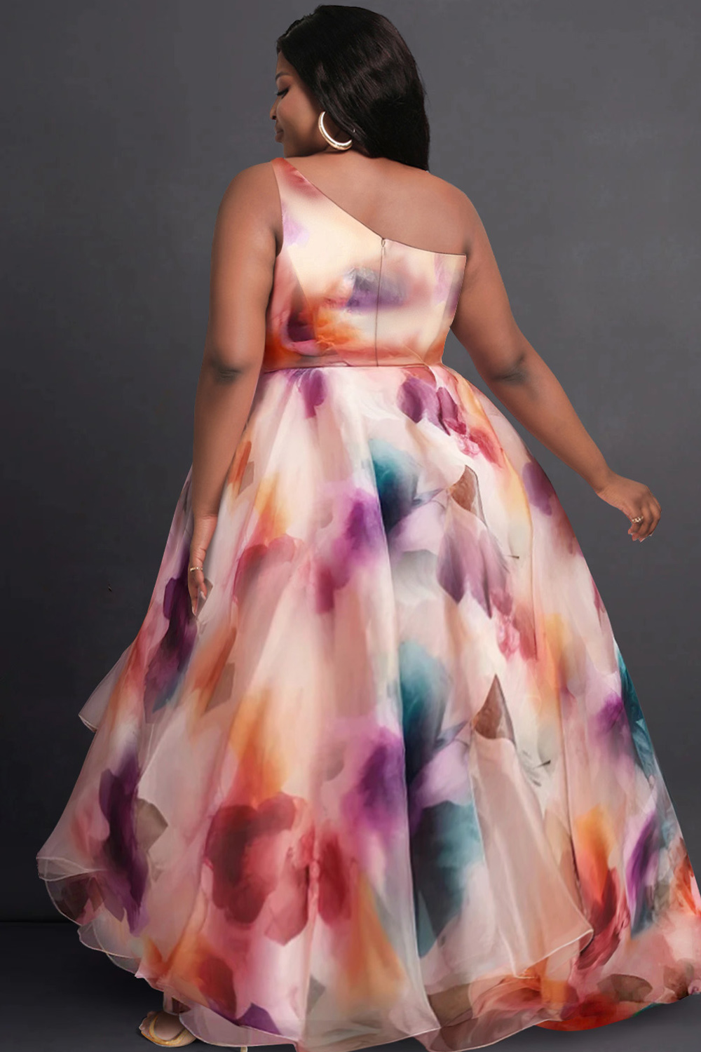 Xpluswear Design Plus Size Semi Formal Elegant Pink Floral Oblique Collar One Shoulder Irregular Hem Tulle Maxi Dresses