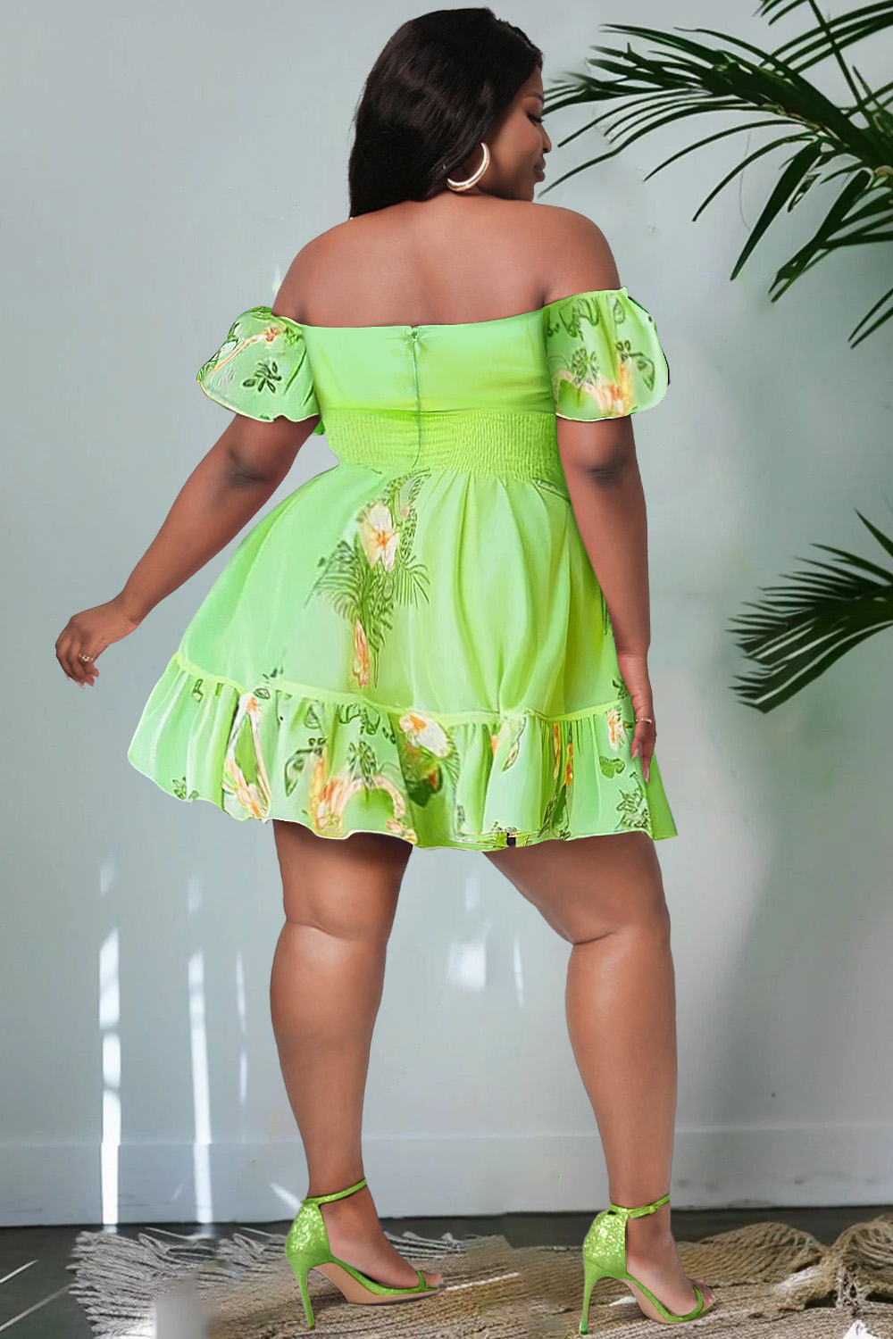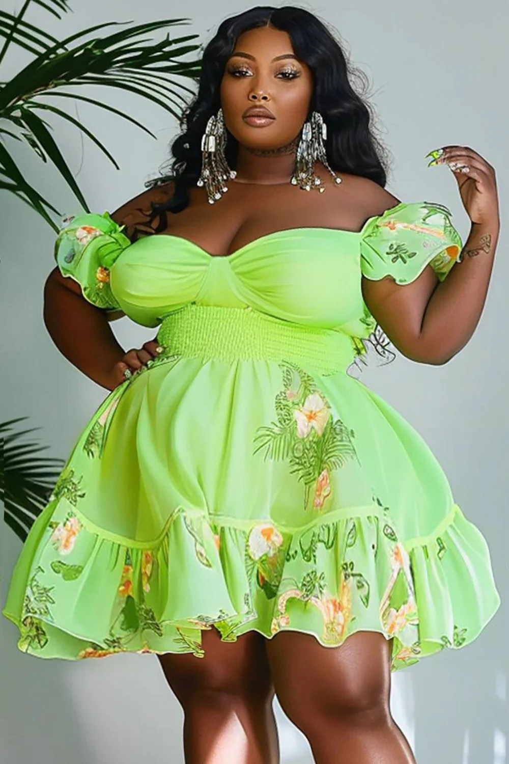 • Xpluswear Design Plus Size Vacation Fluorescent Neon Green Floral Off The Shoulder Smocking Organza Mini Dresses
