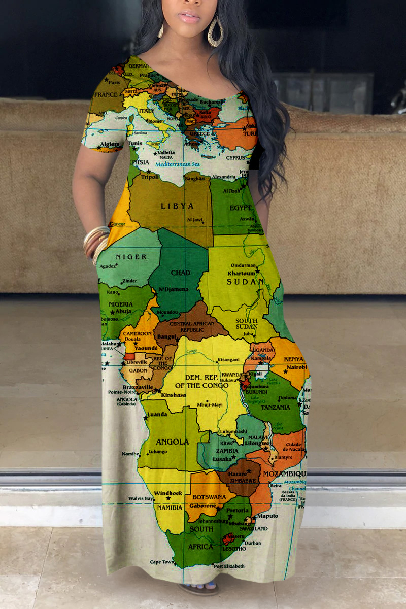 The maxi dress is an everyday go-to piece in humid temperatures. It features comfortable materials, a flattering loose-fit style, and an eye-catching map print. The dress is forgiving on body imperfections and can create a casual yet stylish look. You can play with sandals, sneakers, or flip-flops. It is a good option to wear the dress for nights out, clubs, parties, picnics, parks, and running errands.