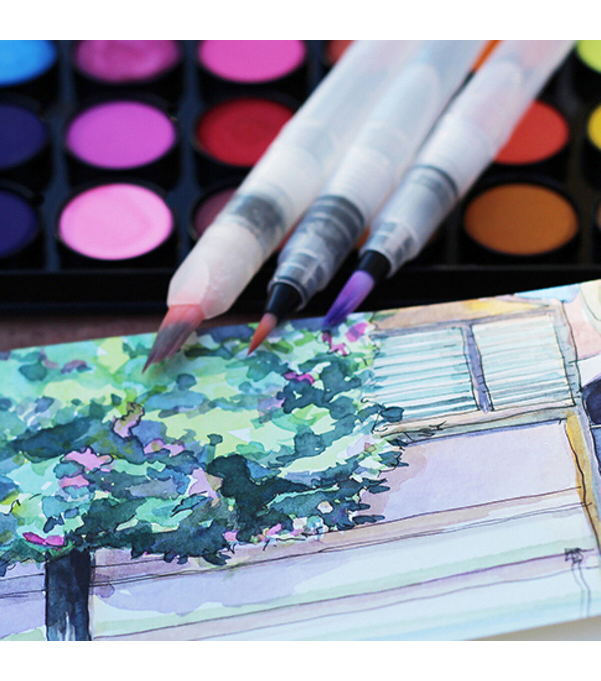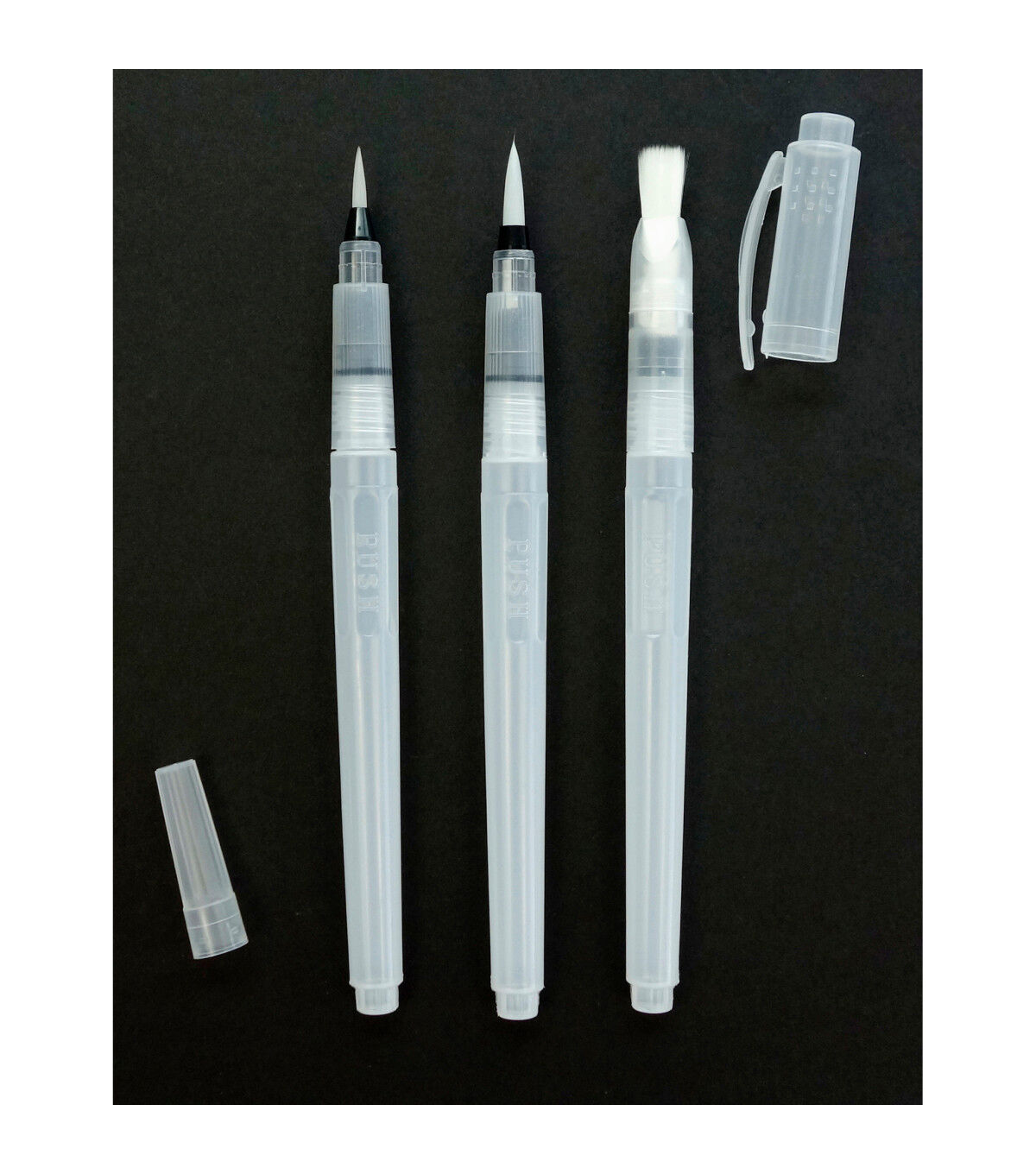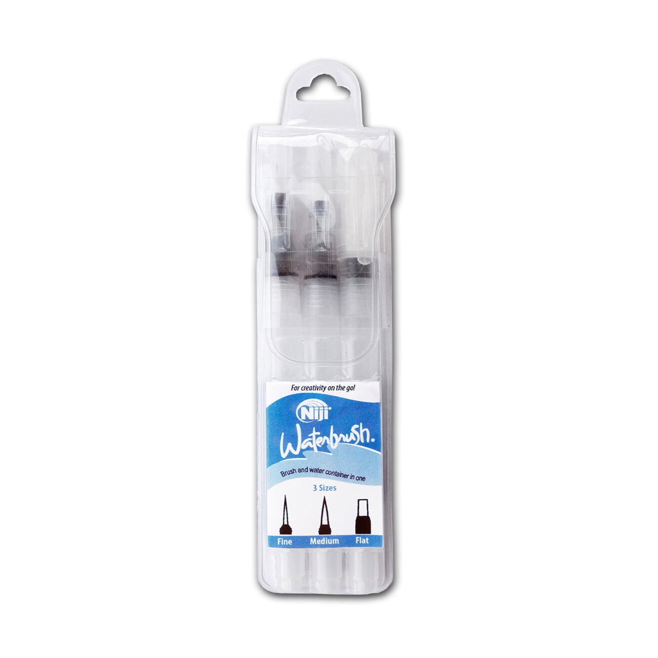 Water is at your fingertips with this inventive brush. If simplicity, elegance and flow are what you seek in a watercolor brush then the Niji Waterbrush is for you. A brush and water container in one, the waterbrush allows you to create on the go and minimizes clutter. Water is stored in the hollow plastic handle and is released through the bristles with just a squeeze. The mini brush has a short handle for versatility. The small, medium, large and flat brushes have long barreled handles; this set includes a Fine (3mm), Medium (5mm) & Flat (8mm) waterbrush.