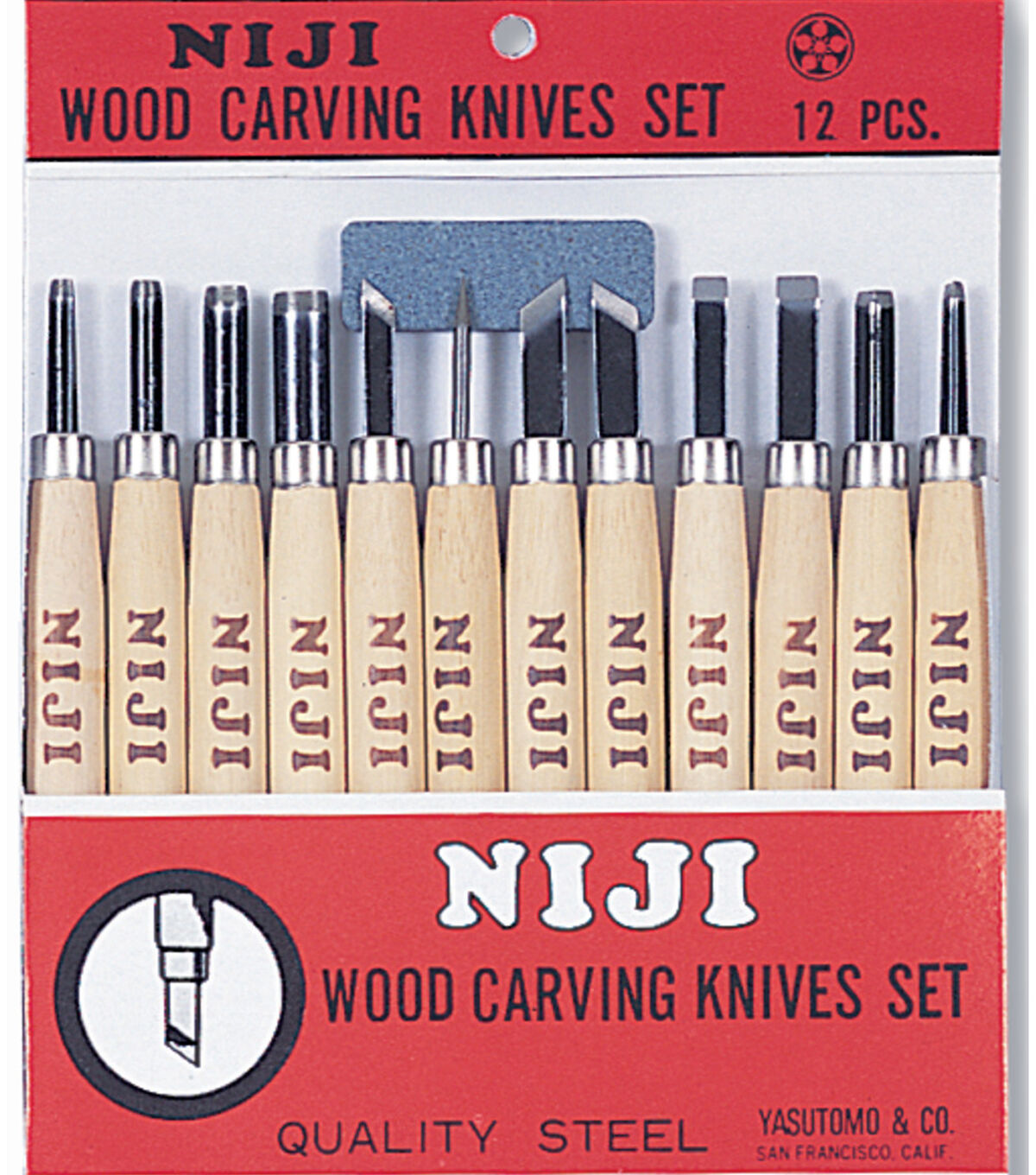 This wood carving knife set features twelve different tools for various carving projects, from soft to hard surfaces.