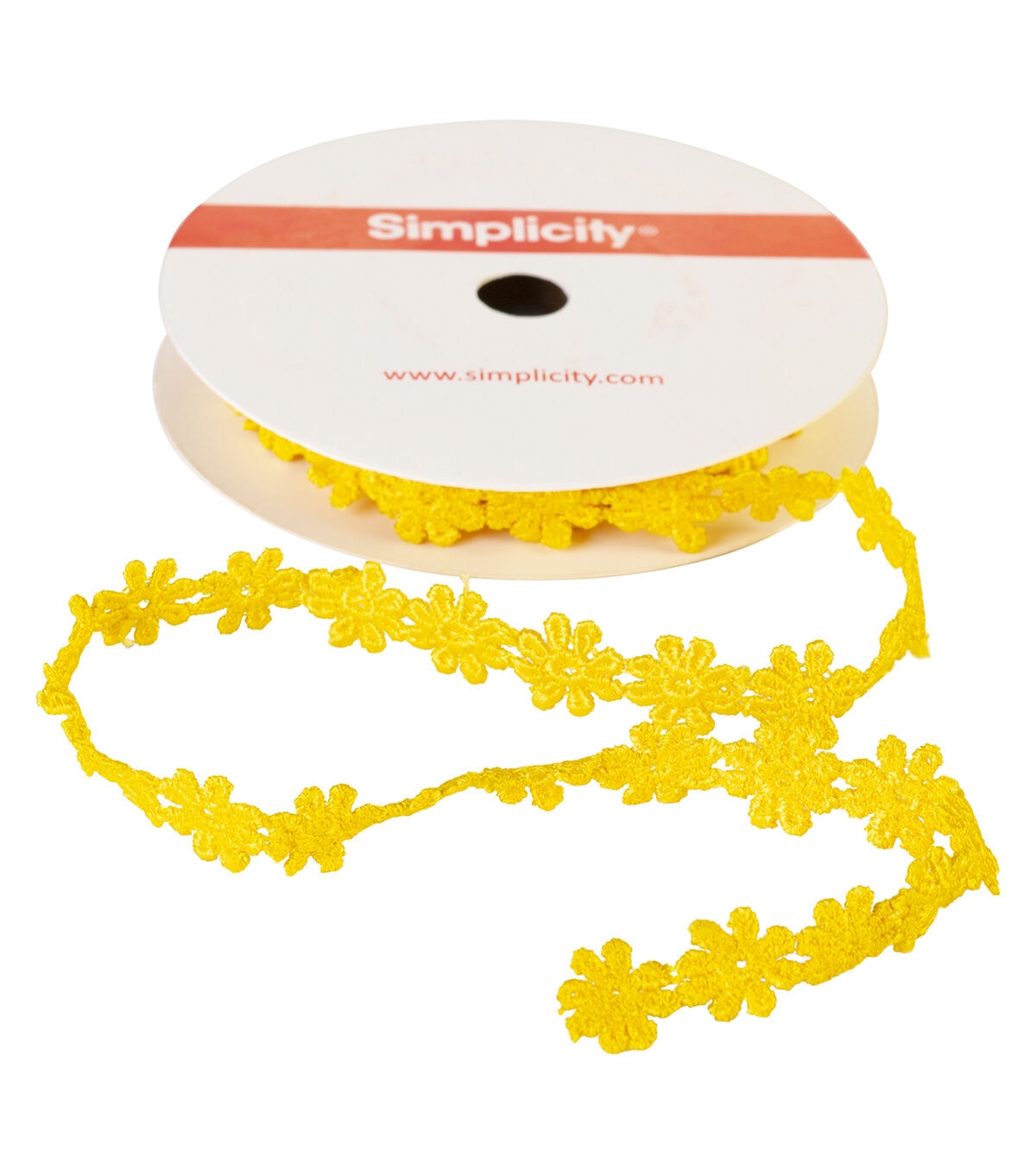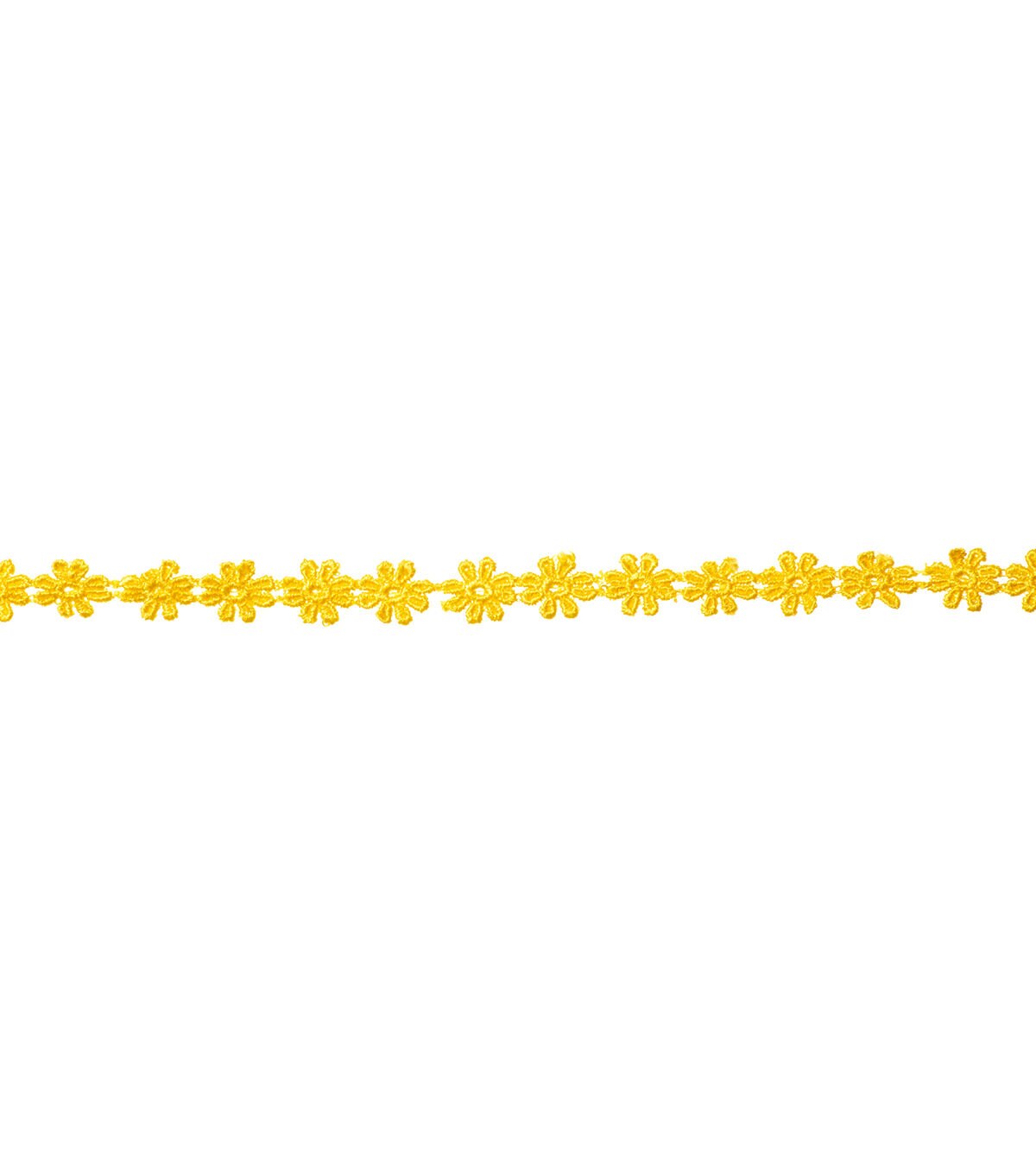 This 1/2 inch yellow daisy floral chain is 100% polyester. Use this easy trim for apparel design, home décor inspirations and so much more!