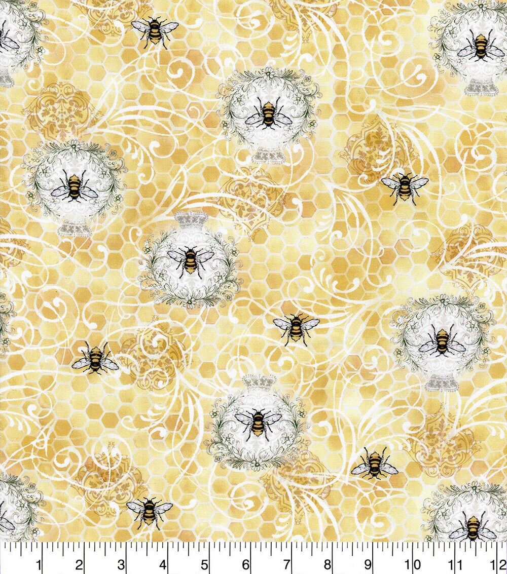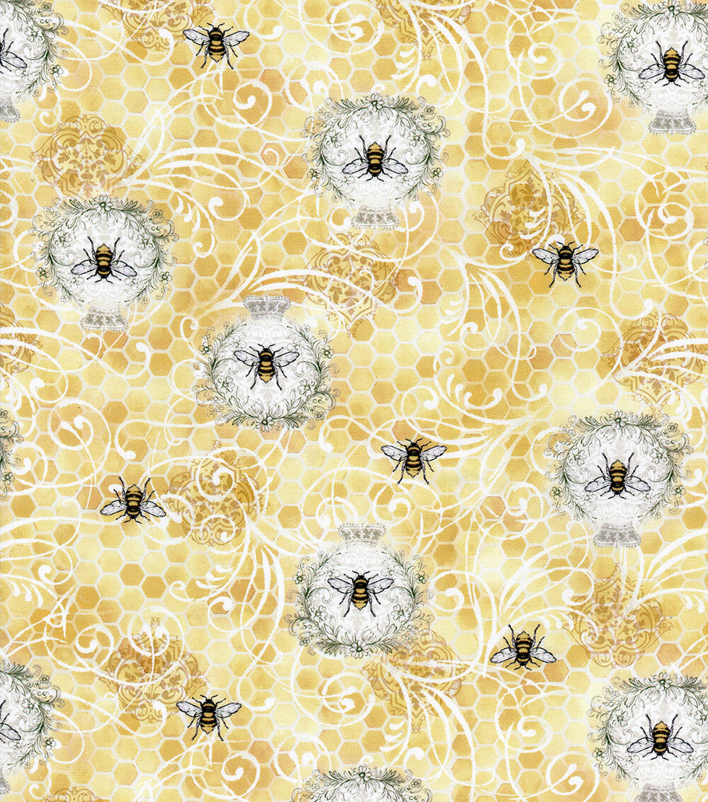 • Yellow Sunny Bee Scrolls Premium Cotton Fabric